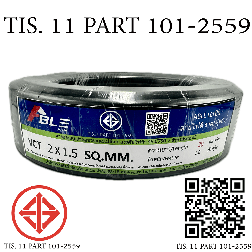 ABLE สายไฟ VCT 2x1.5 20 เมตร(แบ่งขาย) ดำ มอก.