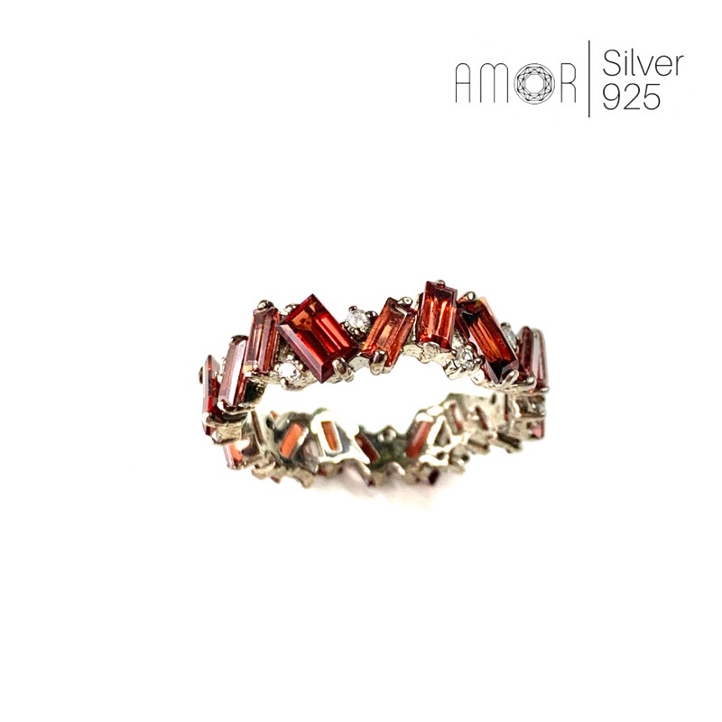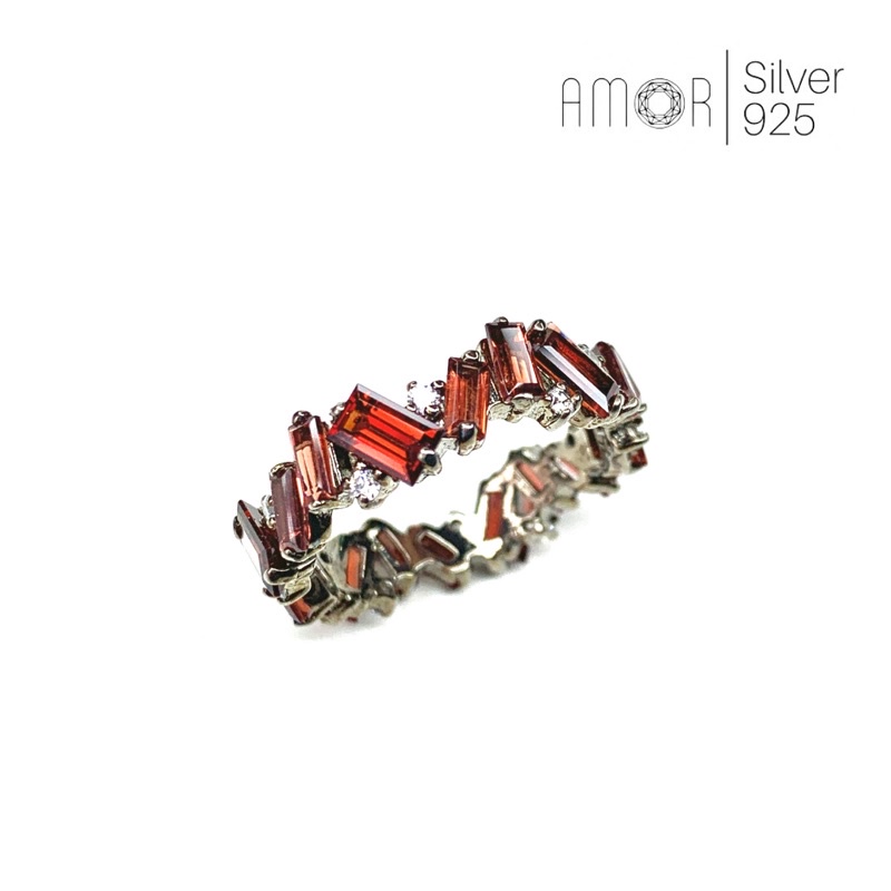 แหวนเงินแท้ 925 แหวนรอบนิ้ว Eternity Ring ฝังพลอยโกเมน(Garnet) ทรงบาเก็ตรอบและเพชร cz
