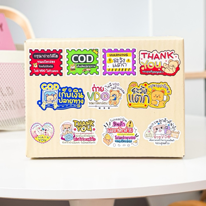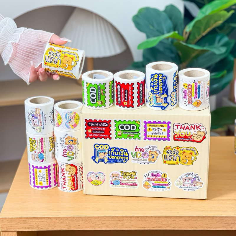 [รวม] สติ๊กเกอร์แปะกล่องพัสดุ ม้วน 250ดวง สติกเกอร์ระวังแตก ถ่ายวีดีโอ Thankyou COD กันน้ำ ลายน่ารัก