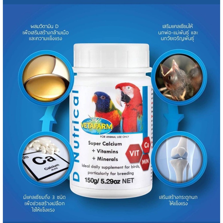 Vetafarm D Nutrical วิตามินนก เสริมแคลเซียม สำหรับนกพ่อ-แม่พันธ์และลูกนกที่กำลังโต (แบ่ง 20G)