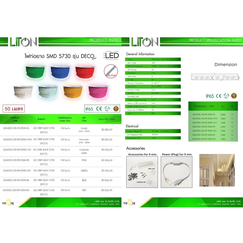 ไฟริบบิ้น ไฟเส้น 5730 LED LiTON รุ่น DECO ไฟท่อยางแบน ไฟสายยาง ความยาว50เมตร มีให้เลือก 7แสง