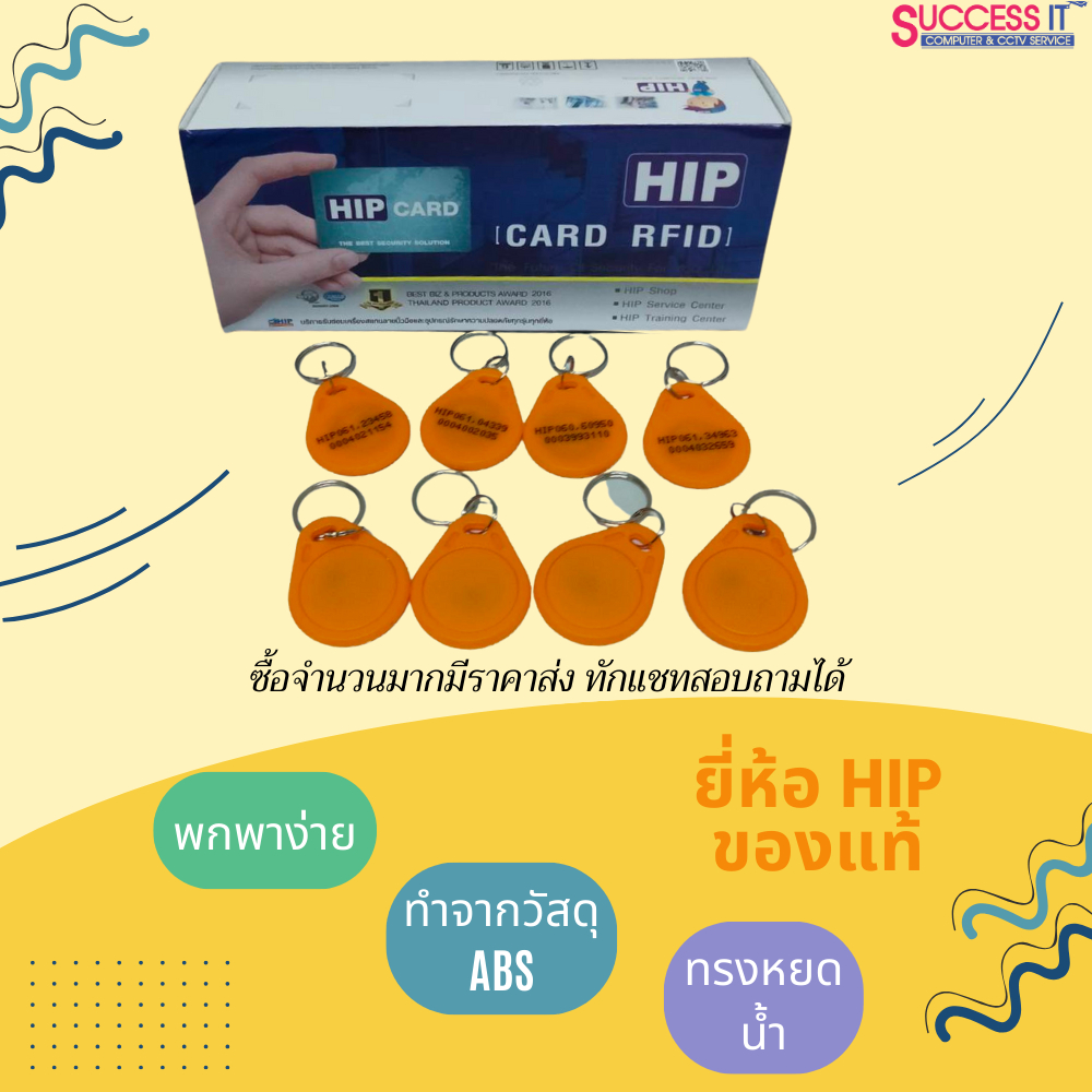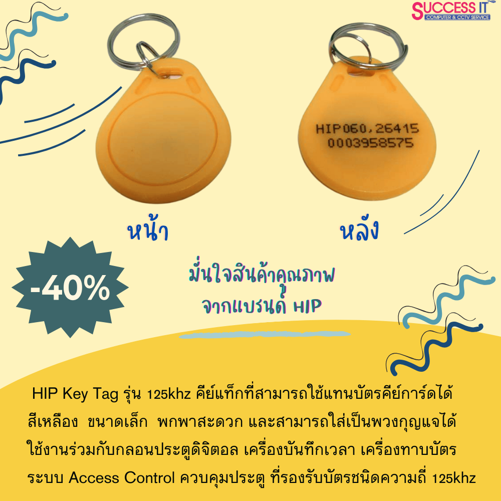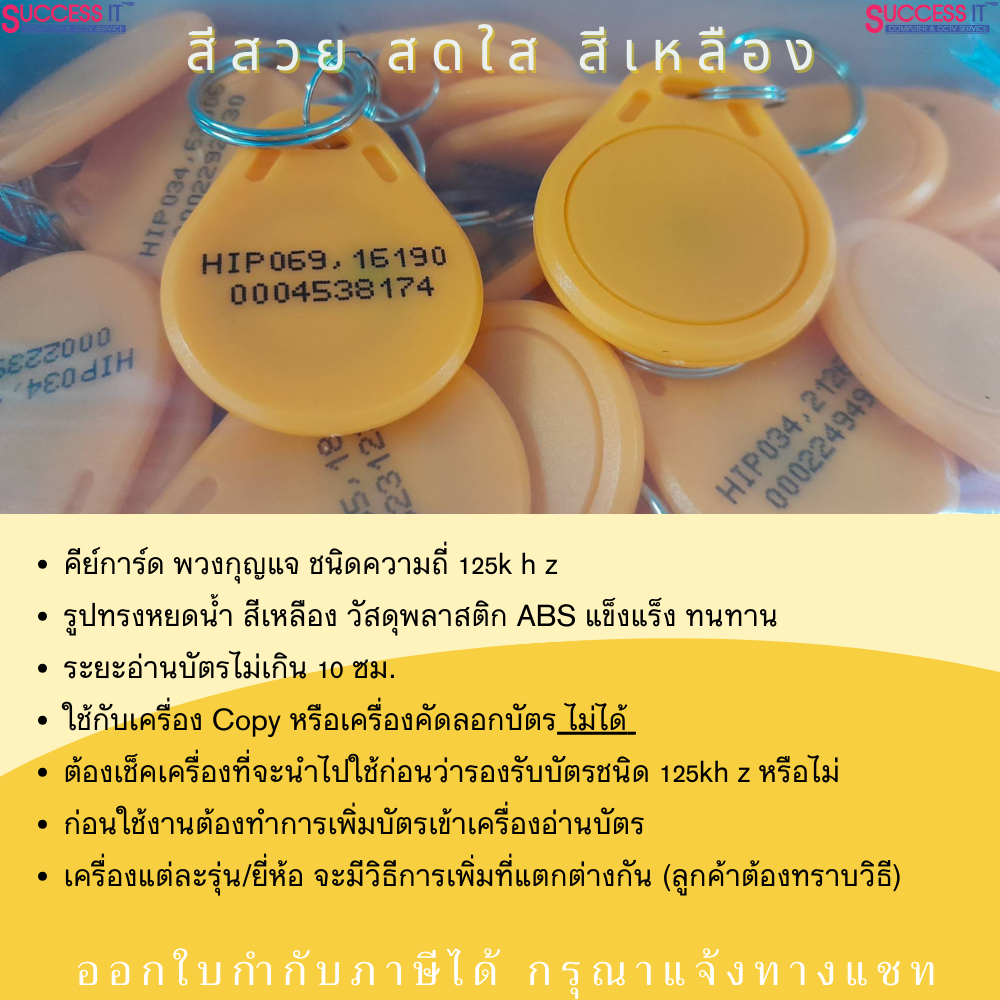 บัตรคีย์การ์ด ทรงหยดน้ำ ยี่ห้อ HIP KeyTag ความถี่125KHz สีเหลือง สำหรับเครื่องทาบบัตร ประตูคีย์การ์ด