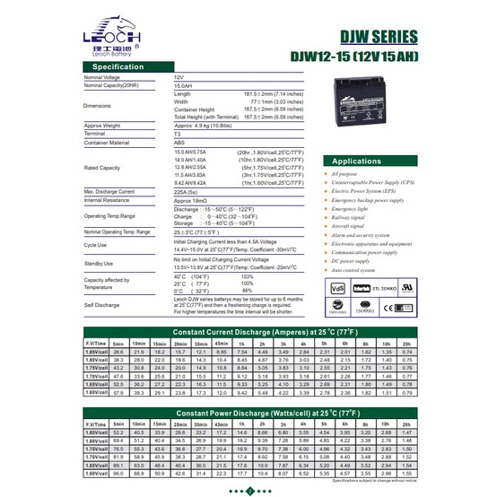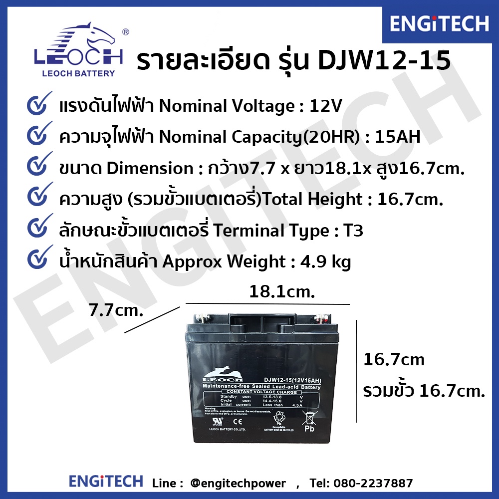 LEOCH แบตเตอรี่ แห้ง DJW12-15 ( 12V 15AH ) VRLA Battery แบต เครื่อง สำรอง ไฟ UPS ไฟฉุกเฉิน