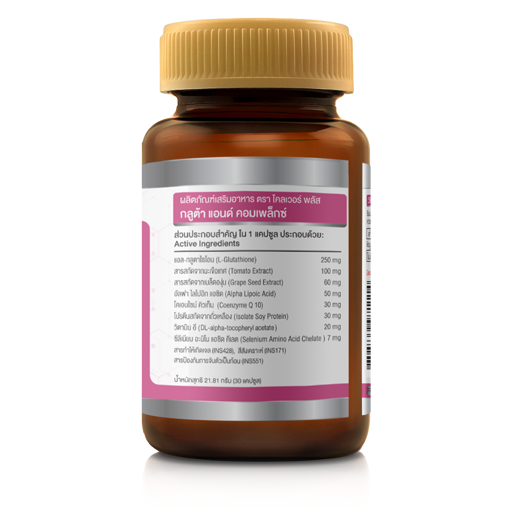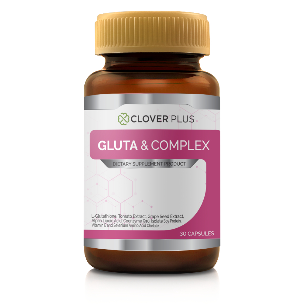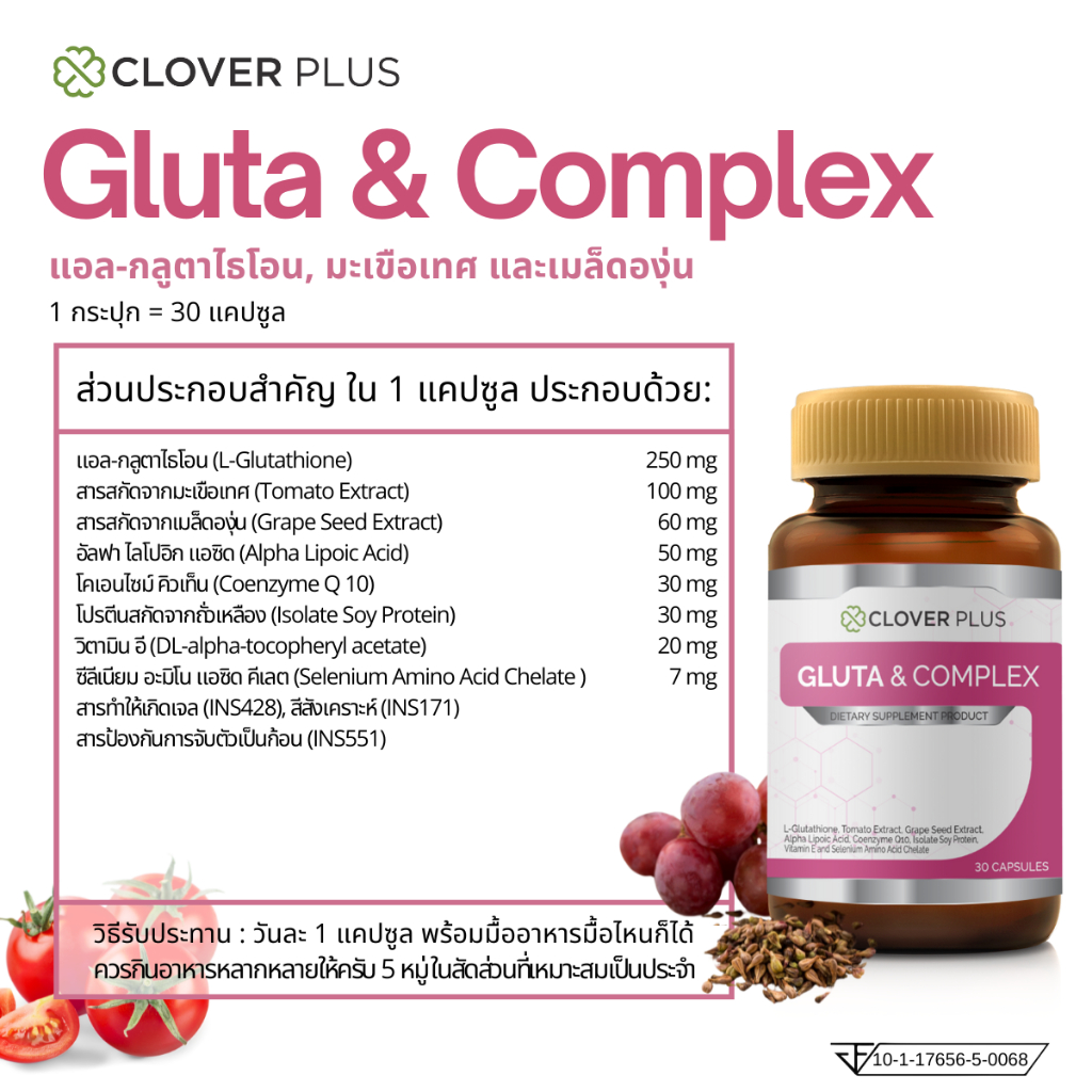 แพ็คคู่ Clover Plus Gluta & Complex กลูต้า คอมเพล็กซ์ แอล-กลูต้าไธโอน มะเขือเทศ วิตามินอี 2 กระปุก (30 แคปซูล)