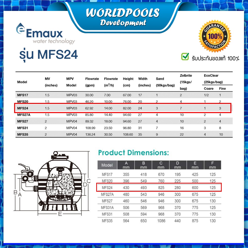 ถังกรองทราย EMAUX MFS24 (Side Mount) ขนาด 24" ถังกรองสระว่ายน้ำ อัตราการกรอง 14 คิว/ชม.
