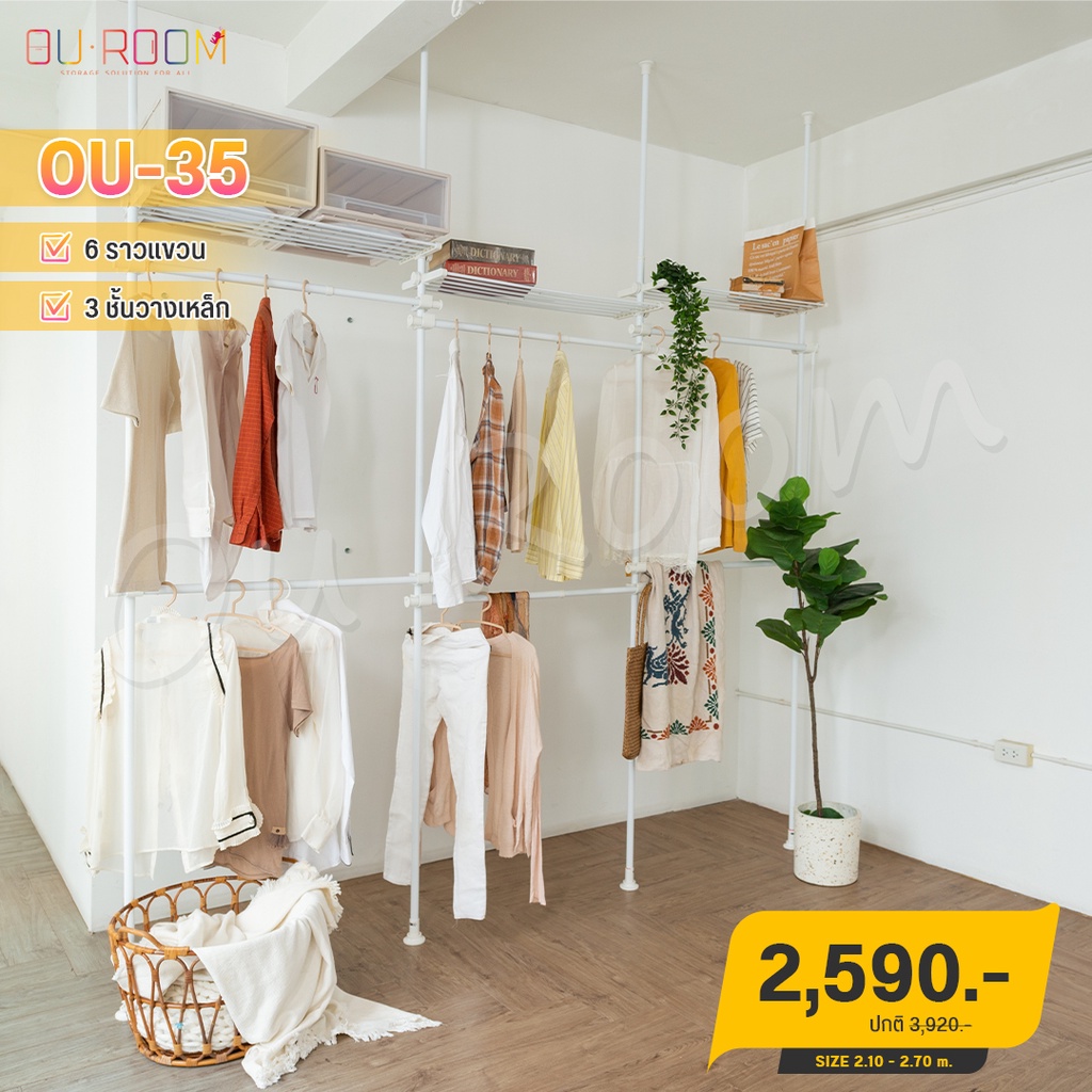 OUROOM ราวแขวนเสื้อ ราวแขวนผ้า ราวแขวนไม่ต้องเจาะ ราวแขวน DIY 4 เสา 6 ราวแขวน 3 ชั้นวางเหล็ก (OU-35)
