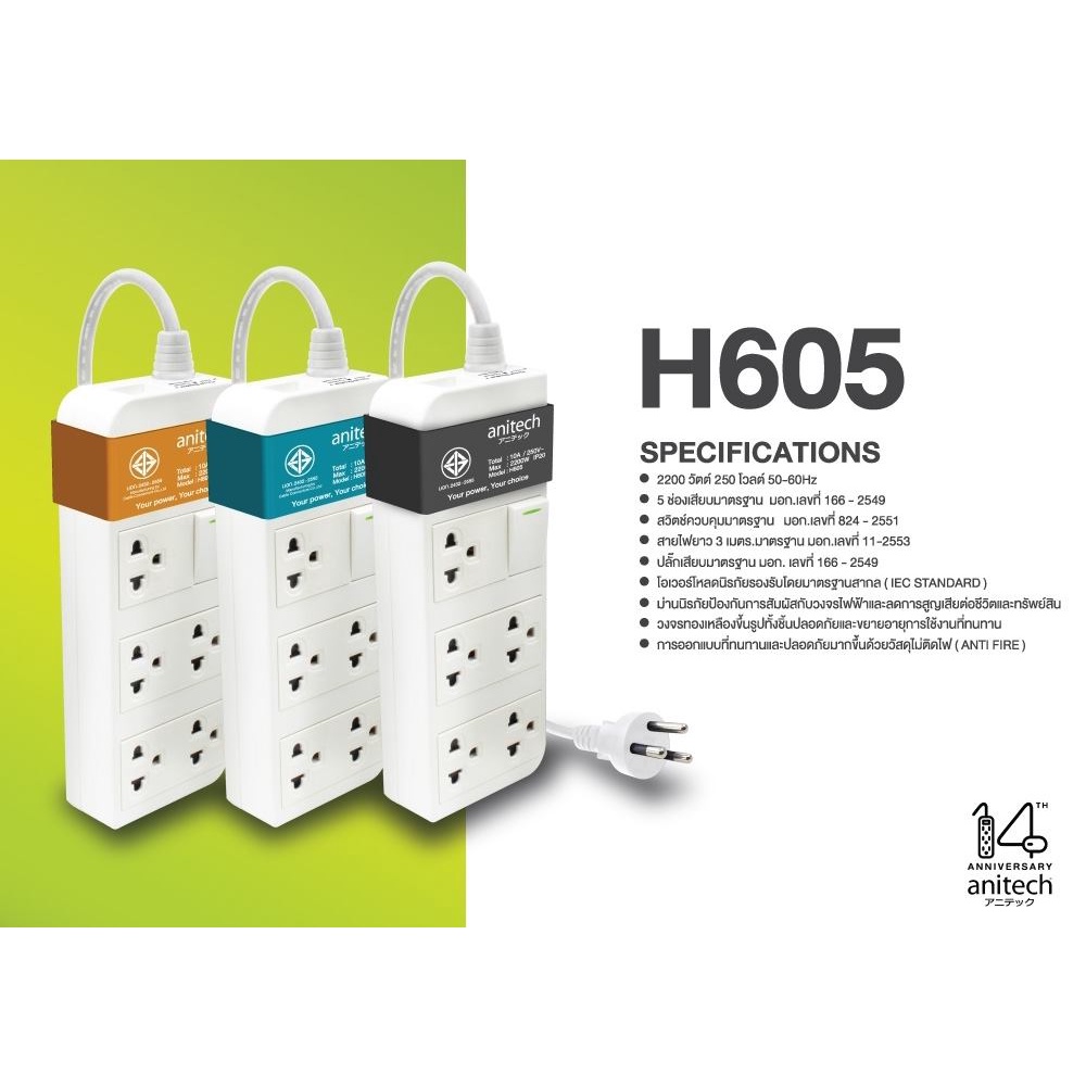Anitech แอนิเทค ปลั๊กไฟมาตรฐาน มอก.รุ่น H605 สายไฟยาว 3 เมตร **สินค้าเคลียร์**