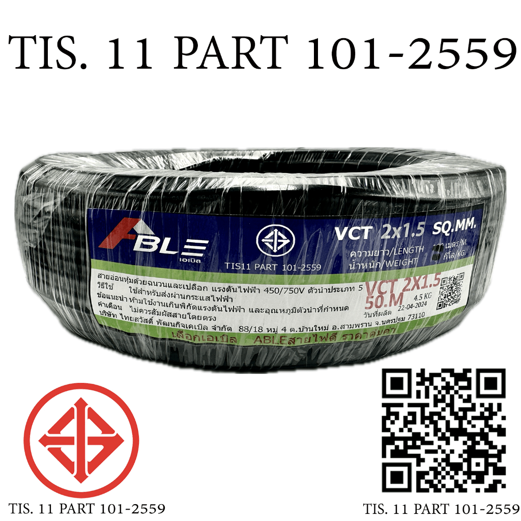 ABLE สายไฟ VCT 2x1.5 50 เมตร(แบ่งขาย) ดำ มอก.