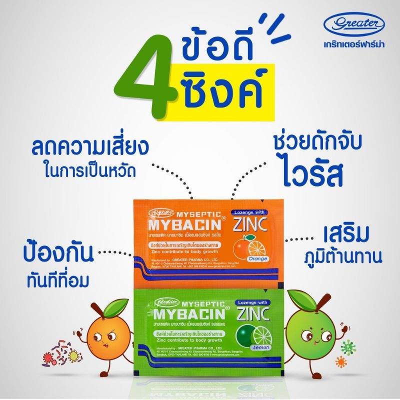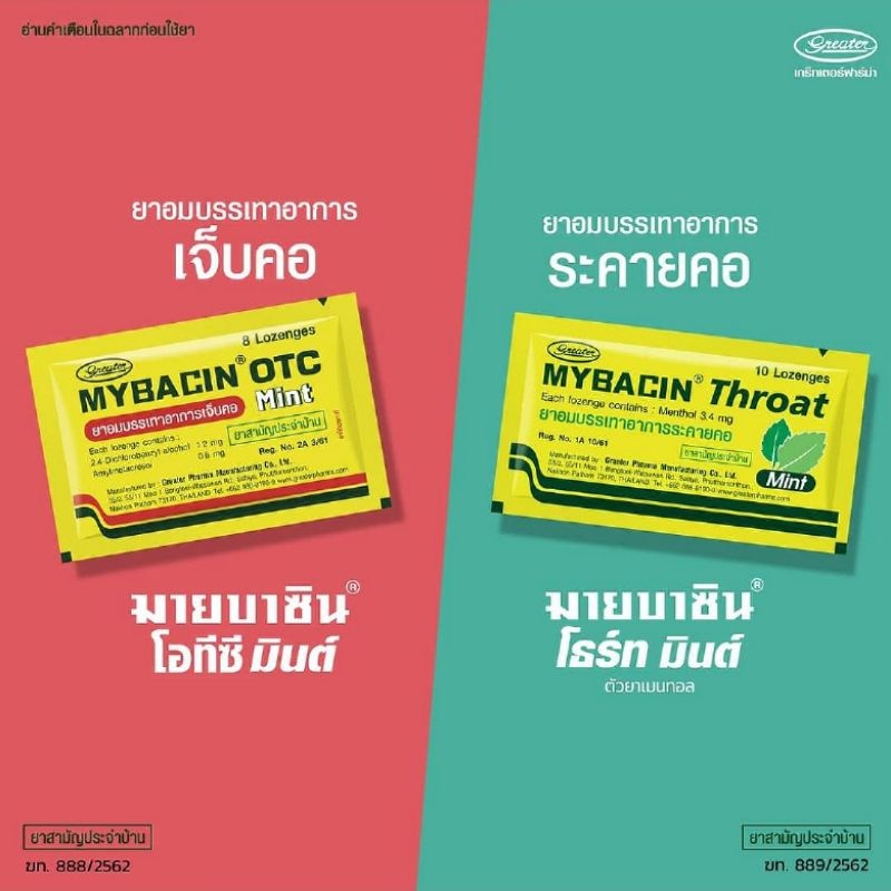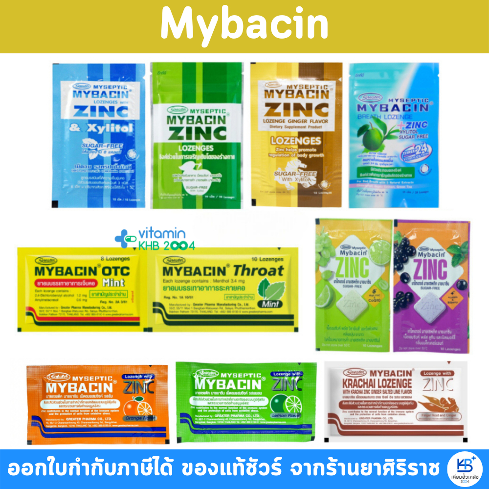 Mybacin เม็ดอมมายบาซิน ยาอม บรรเทาอาการเจ็บคอ OTC Mint และ THROAT Mint Zinc & Xylitol Sugarfree