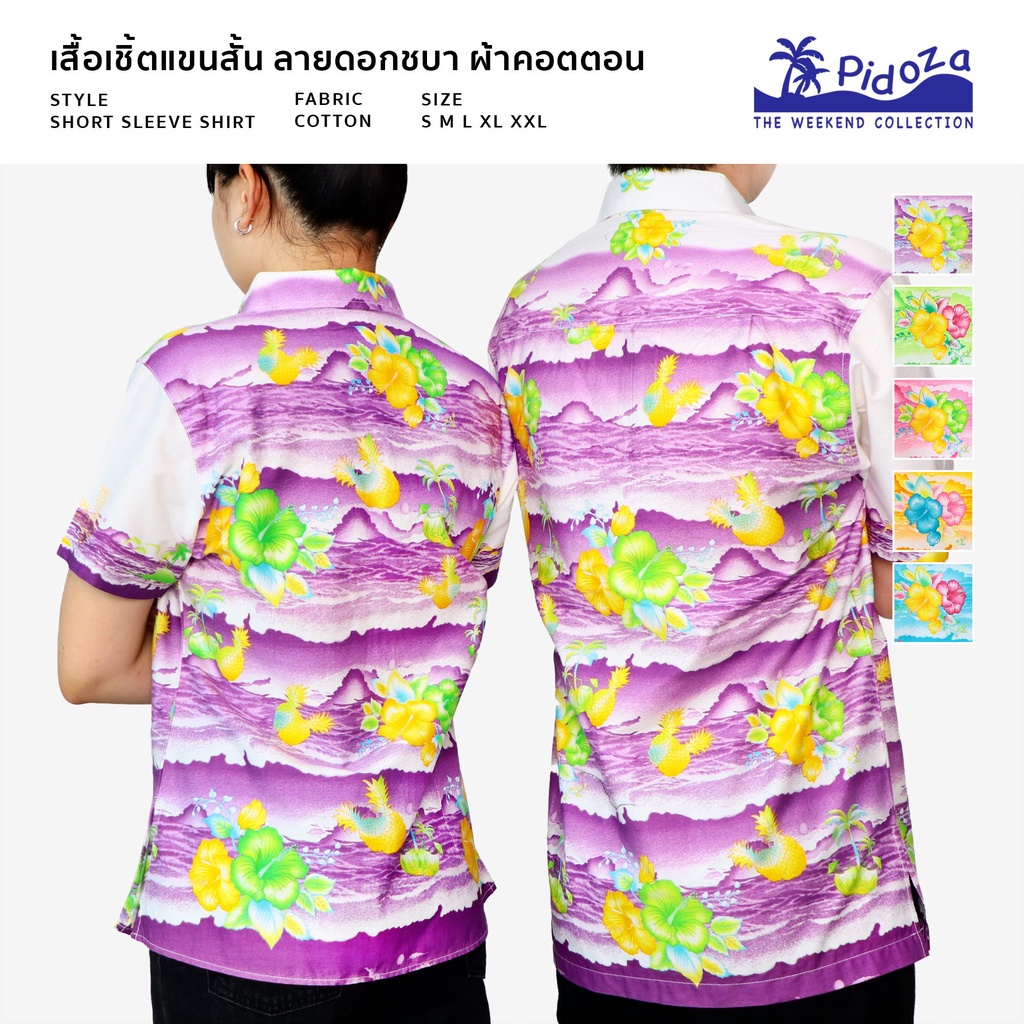 เสื้อเชิ้ตสงกรานต์ลายดอก เสื้อคู่พ่อ/แม่ ลายดอกชบา ผ้าคอตตอน