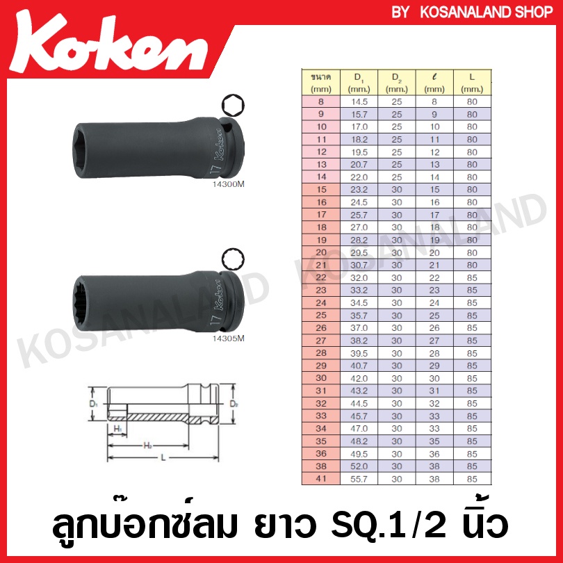 Koken ลูกบ๊อกซ์ลม ยาว SQ.1/2 นิ้ว 12 เหลี่ยม รุ่น 14305M (มีให้เลือกตั้งแต่ ขนาด 8 - 36 มม.) ( Impact Socket )