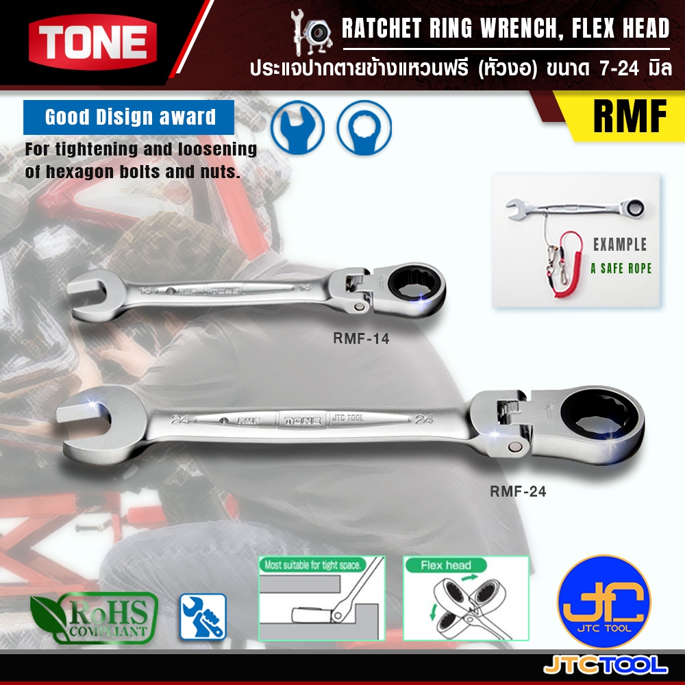 TONE ประแจปากตายข้างแหวนฟรีหัวงอ ขนาด 7-24 มิล รุ่น RMF - Ratchet Ring Wrench Individual SizeFlex Head Model RMF