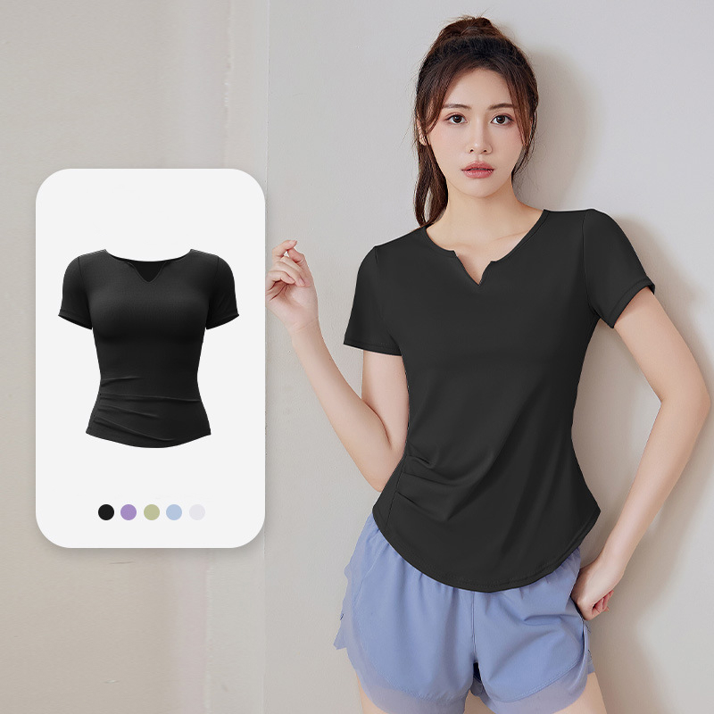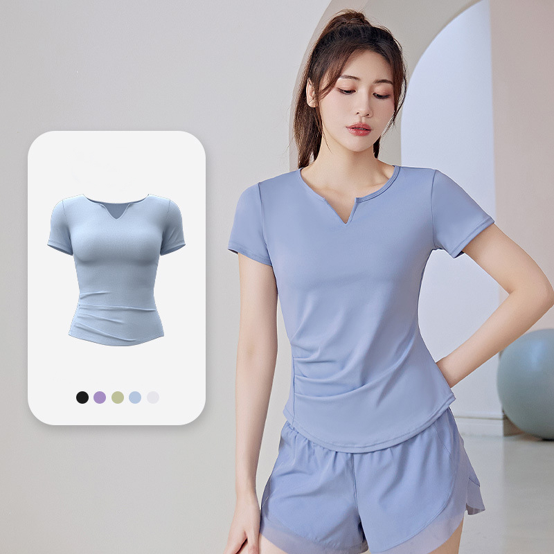 mvp sport เสื้อยืดแขนสั้นผู้หญิง เสื้อยืดคอวีแขนสั้น เสื้อสเวตเตอร์โยคะ ดีไซน์ทรงเข้ารูปจีบ