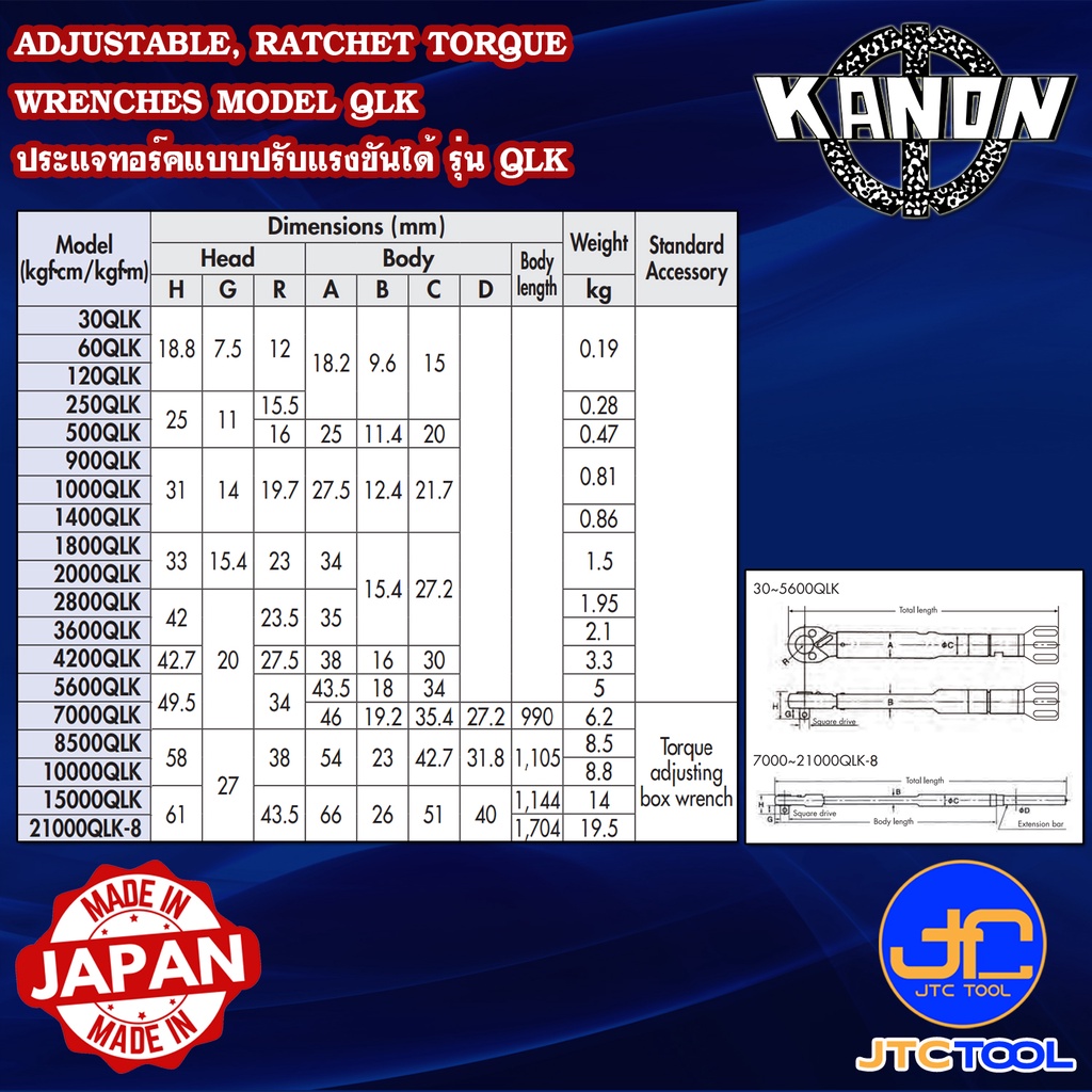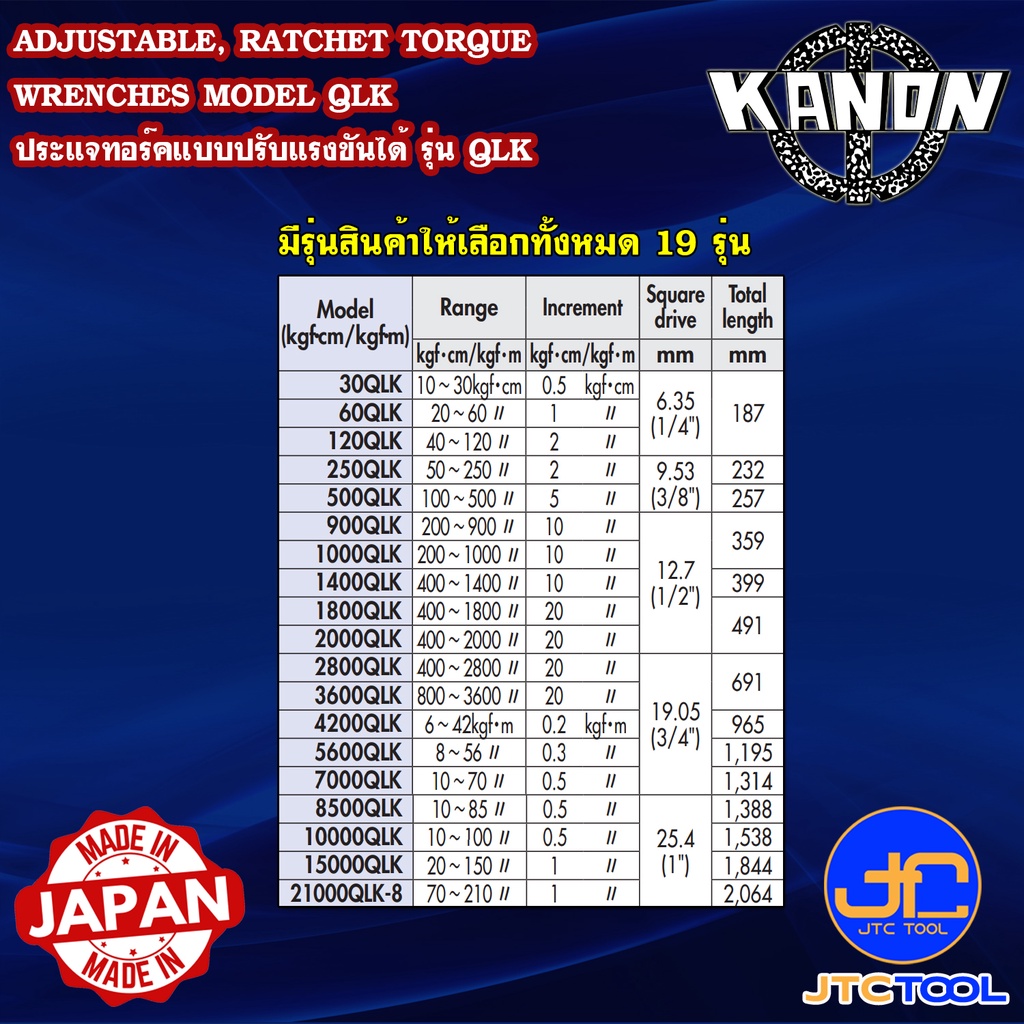 Kanon ประแจปอนด์หัวฟรีซ้ายขวาหน่วยกิโลกรัม รุ่น QLK - Adjustable, Ratchet Torque Wrenches Series QLK
