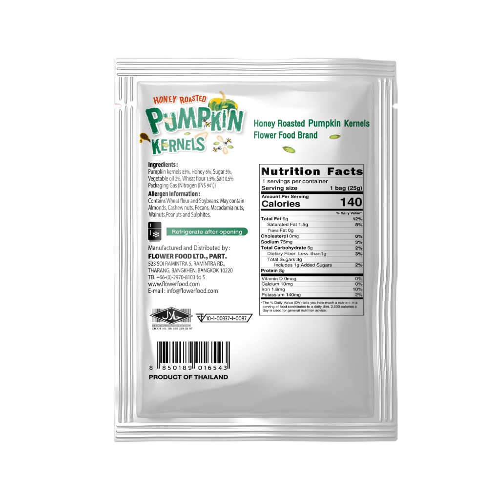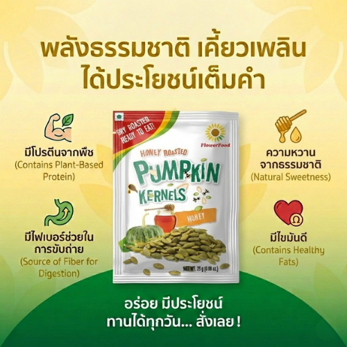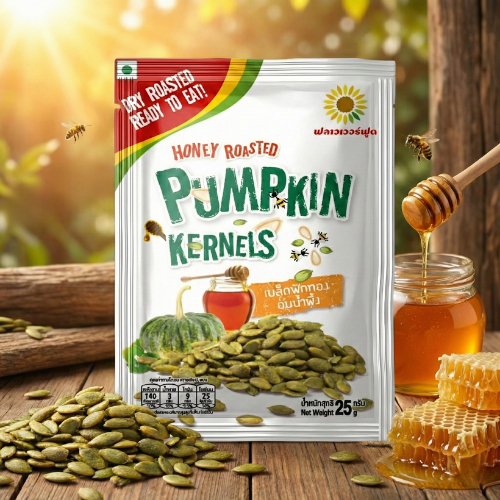 เมล็ดฟักทองอบน้ำผึ้ง 25กรัม (5 ซอง/แพ็ค) Roasted Pumpkin Kernels with Honey 25 g. (5 pieces/pack)