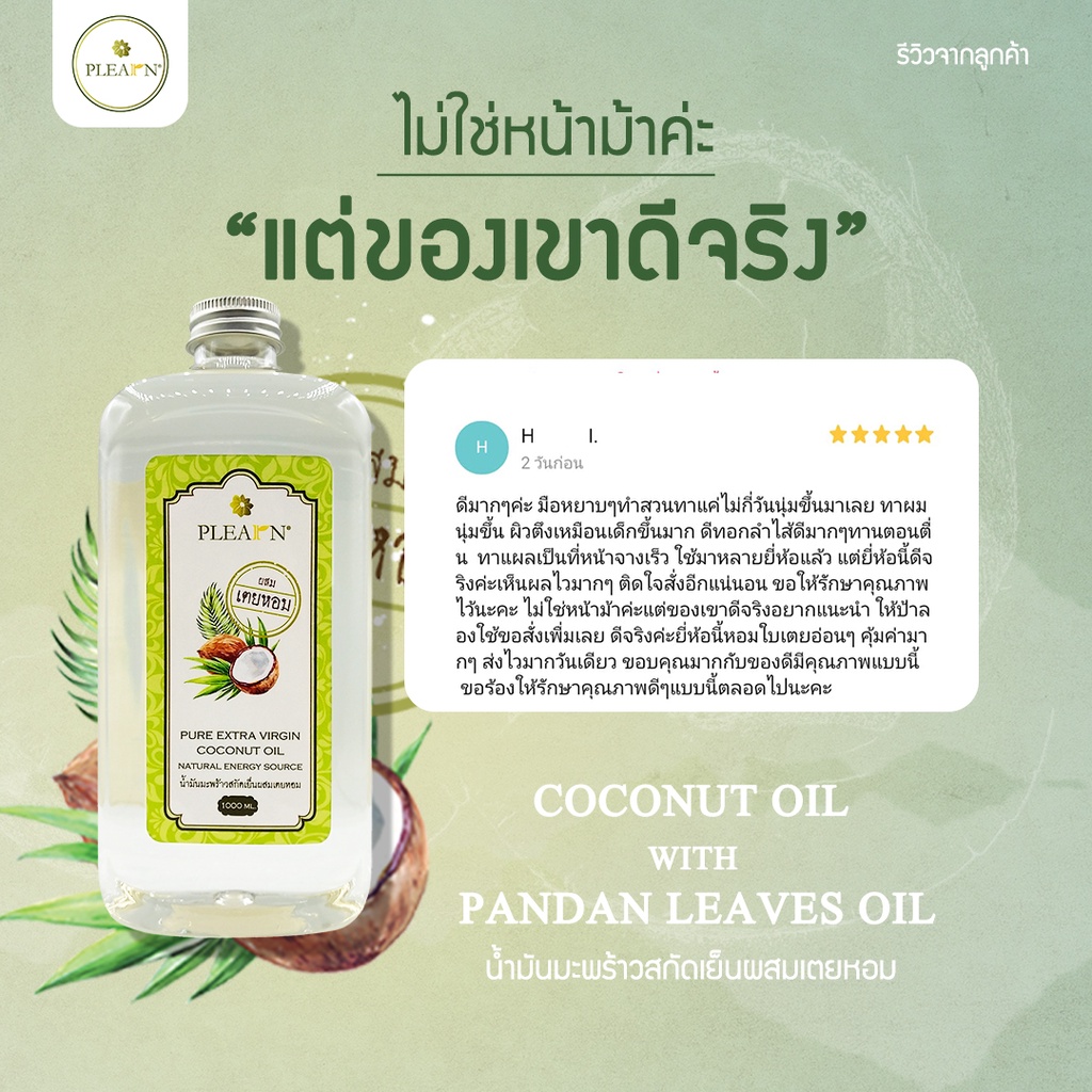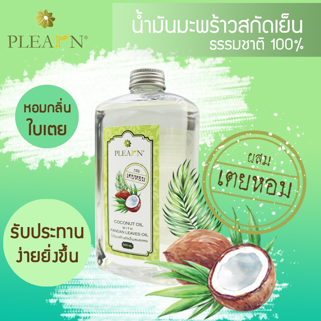 PLEARN น้ำมันมะพร้าวสกัดเย็นผสมเตยหอม 500 ml +หัวปั๊ม Coconut Oil With Pandan Leaves Oil