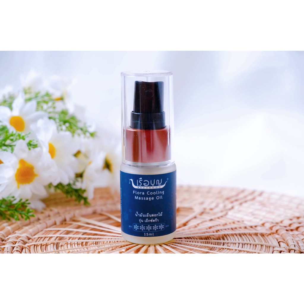 เรือบุญ น้ำมันเย็นดอกไม้ ไมเกรน ออฟฟิศซินโดรม นอนไม่หลับ คลายเครียด แก้ปวด หลับสบาย Flora Cooling Massage Oil 15 ml.