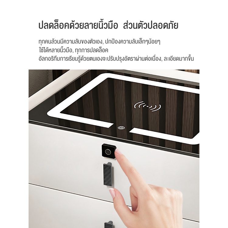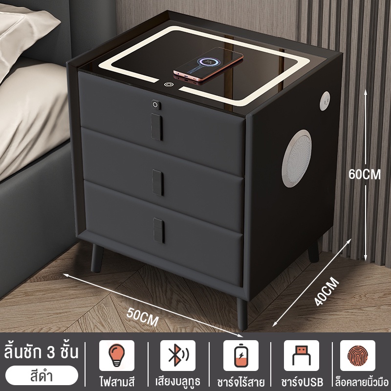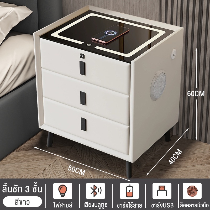 BAIERDI MALLตูข้างเตียง โต๊ะข้างเตียง มาพร้อมกับไฟกลางคืน 3สี +ที่ชาร์จแบบไร้สาย+ลำโพงบลูทูธ 5.0 +สแกนลายนิ้วมือ