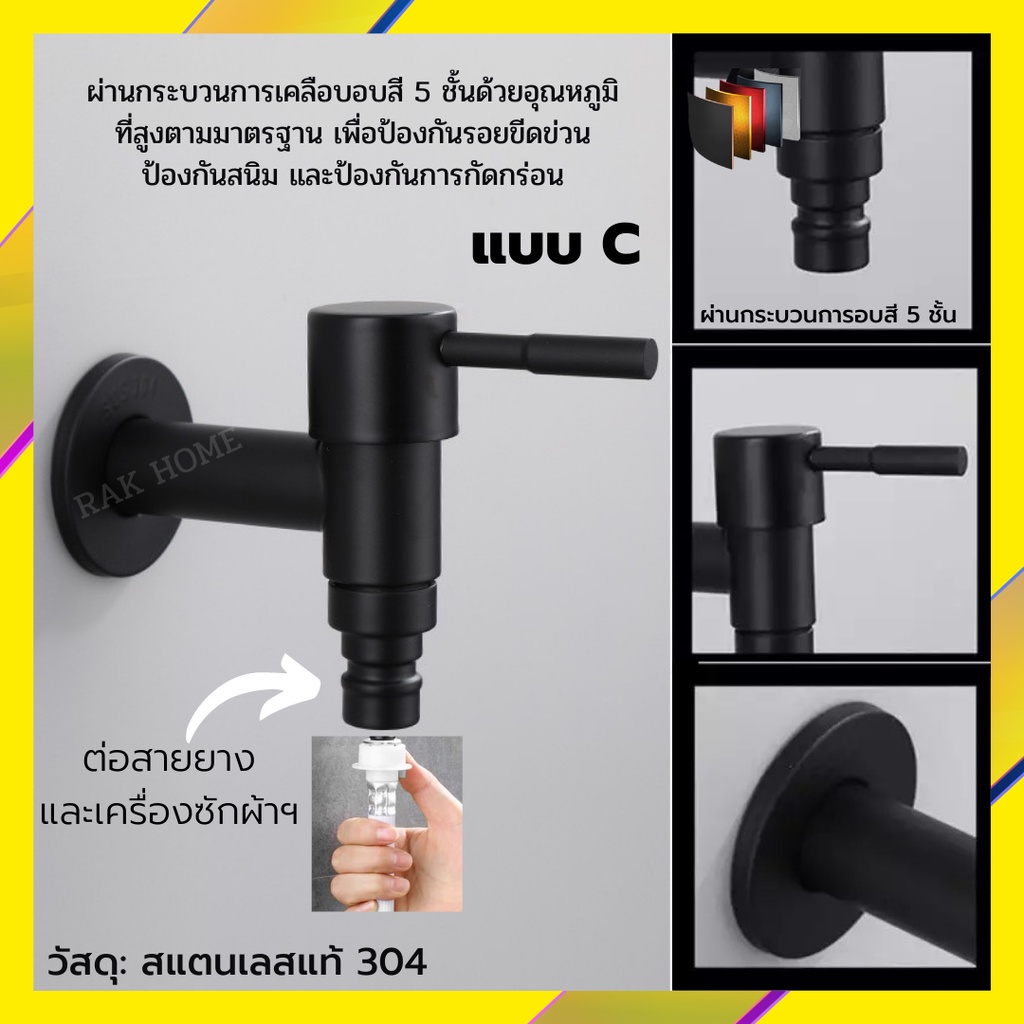 RAK HOME ก๊อกสนาม ก๊อกน้ำเสียบสายยาง ก๊อกน้ำซักล้าง สีดำวัสดุสแตนเลส304 และทองเหลือง ไม่ขึ้นสนิม