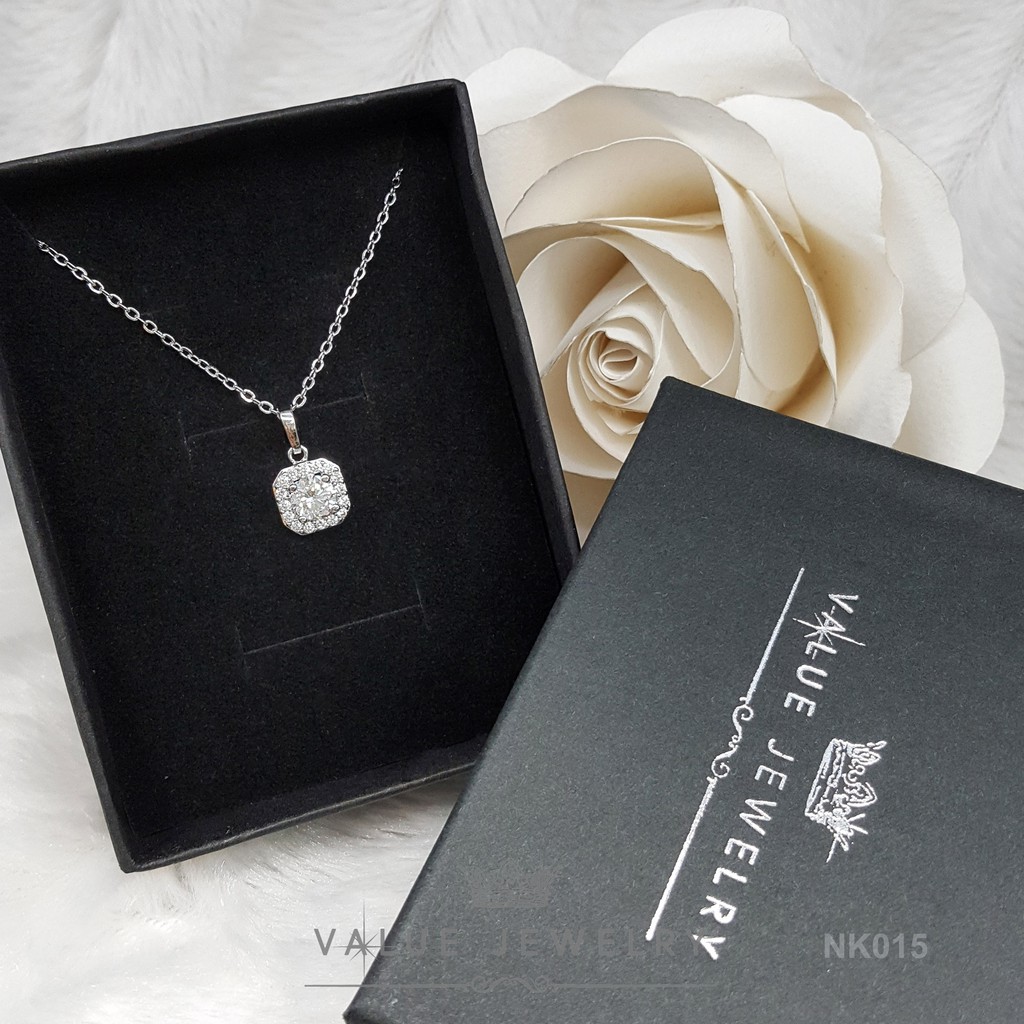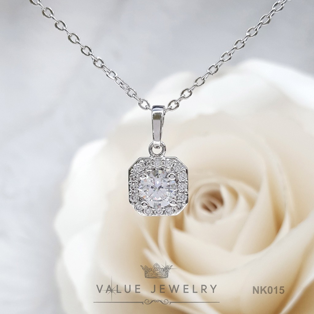 สร้อยคอพร้อมจี้ คริสตัลเพชรกลม Round Brilliant Shape ล้อมเพชรเล็ก ทรงเหลี่ยม ขนาดกลาง เครื่องประดับ สร้อย NK015 ValueJewelry