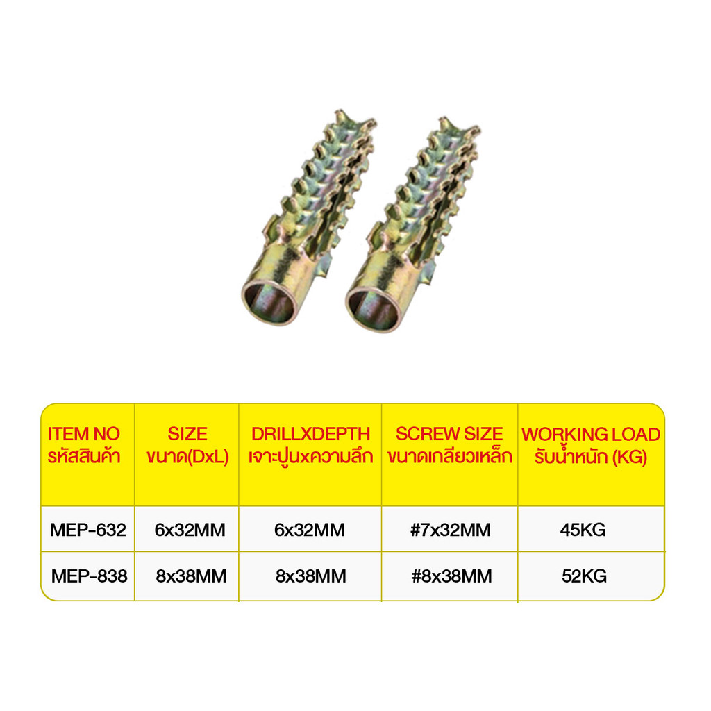 GIANT KINGKONG พุกอิฐมวลเบาพร้อมสกรู รุ่น MEP-632 ขนาด M6 x 32 มม. (แพ็ก 10 ชุด) สีซิงค์รุ้ง