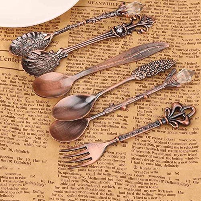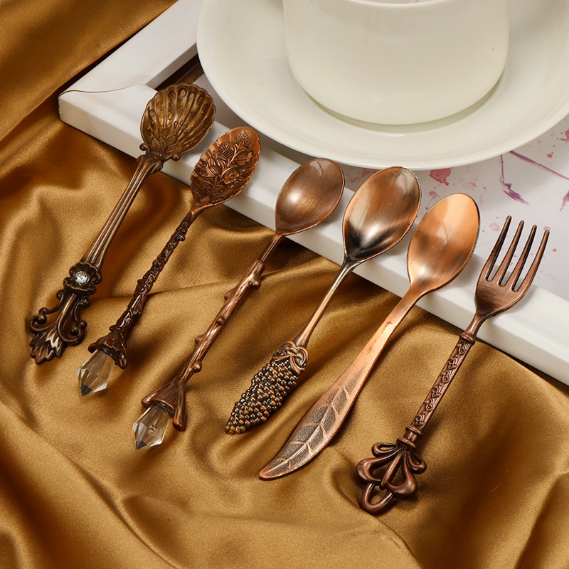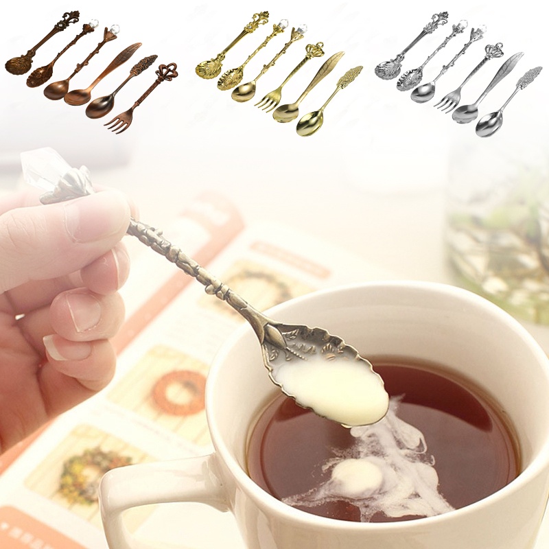 KEMORELA ช้อนกาแฟ ส้อมผลไม้ คลาสสิก ยืดหยุ่น สไตล์ย้อนยุค แกะสลัก ช้อนกาแฟ ช้อนเล็ก ส้อม ช้อนชา 6 ชิ้น
