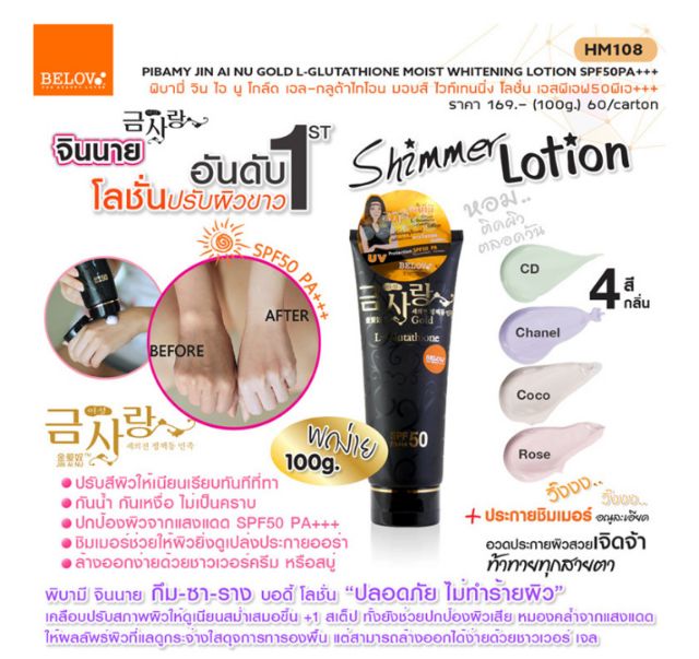 ทาผิวขาว ทาปุ๊บขาวปั๊บ ไม่เป็นคราบไม่ติดขน จินนายโกลล์แอลกูต้าไธโอนไวเทนนิ่งโลชั่น spf50 pa+++ 100g. (หลอดดำมีชิมเมอร์)