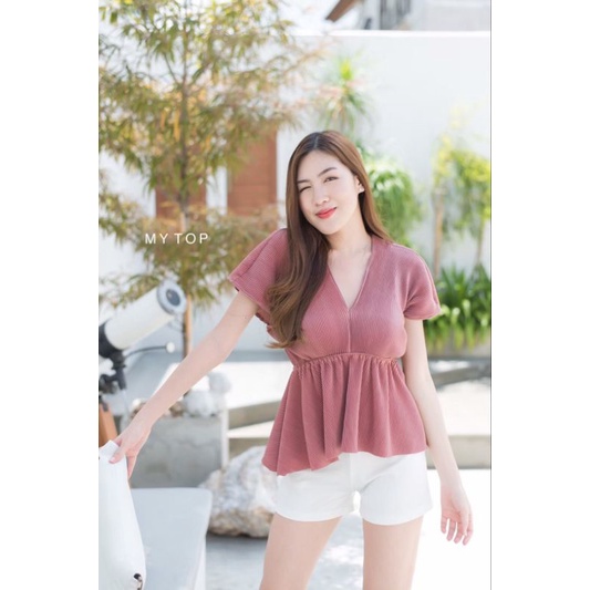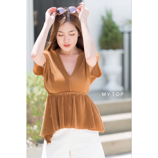 🍒Sale🥑เสื้อคอวีแขนล้ำ ผ้าอัดพลีท ชายระบายเข้าเอว ป้าย MY TOP งานน่ารัก ดูแพง