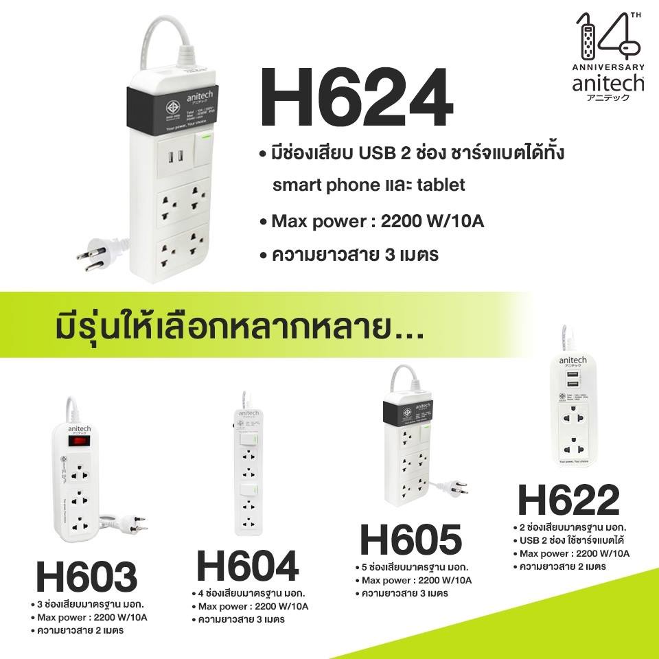 Anitech แอนิเทค ปลั๊กไฟ มอก. 4 ช่อง 2 USB รุ่น H624 สายไฟยาว 3 เมตร สินค้าเคลียร์
