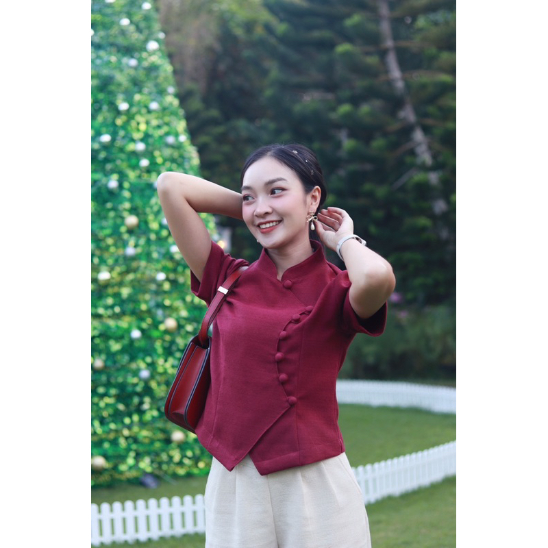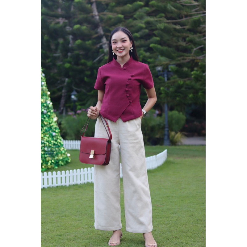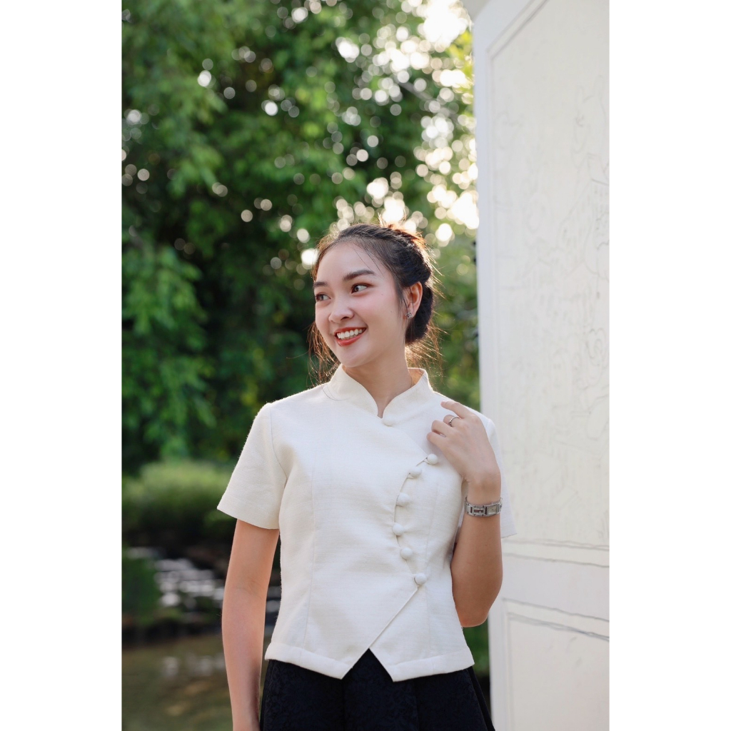 เสื้อสีครีมแขนสั้น ดีเทลเสื้อรุ่นนี้ เป็นทรงคอจีน งานกระดุมปั๊มสุดเก๋ เรียบหรูดูดี