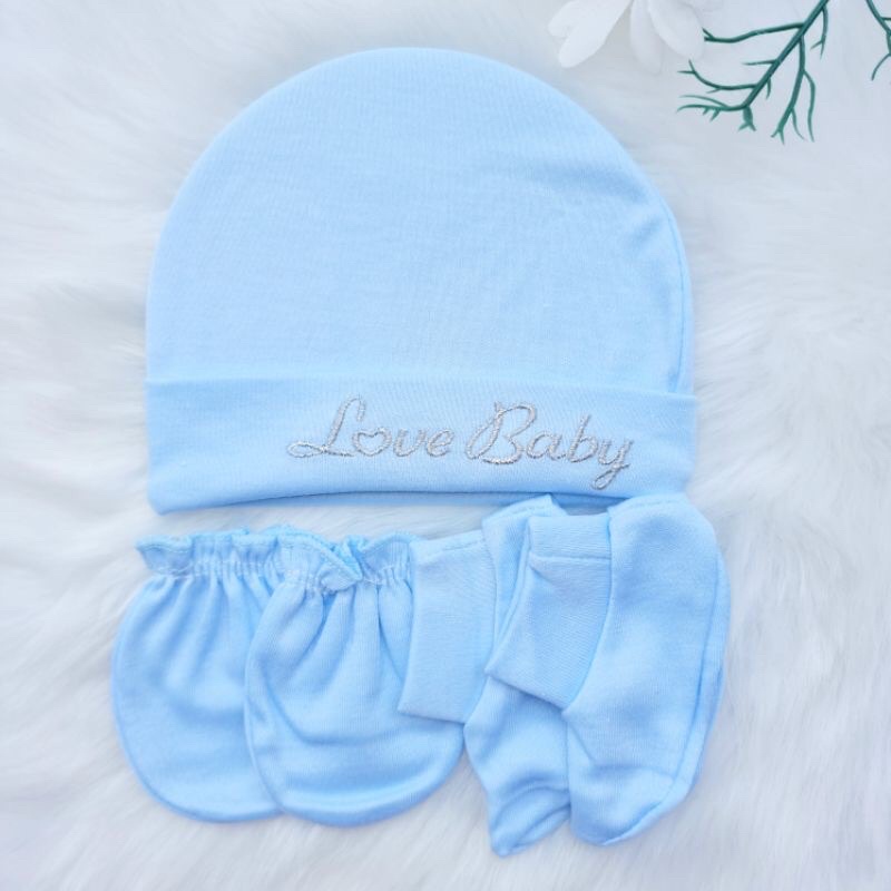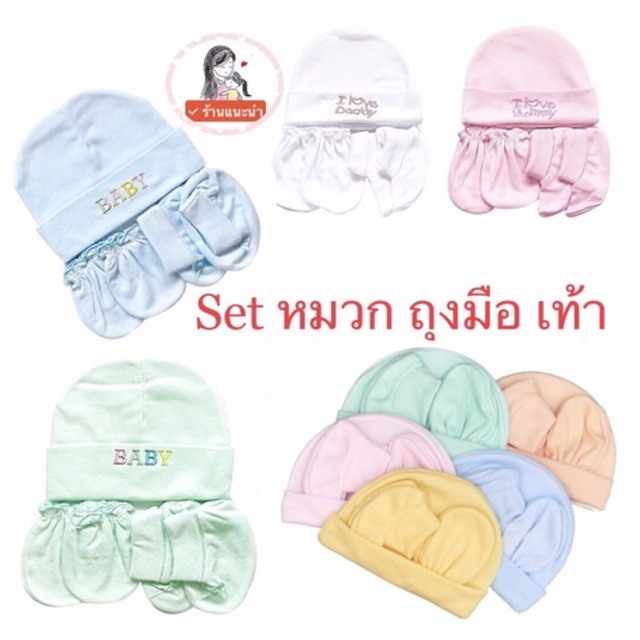 💥พร้อมส่ง หมวก ถุงมือ ถุงเท้าเด็กอ่อน/เด็กแรกเกิดNB สีพื้น 1 set เลือกสีได้ ไม่สามารถเลือกลายปักได้ค่ะ
