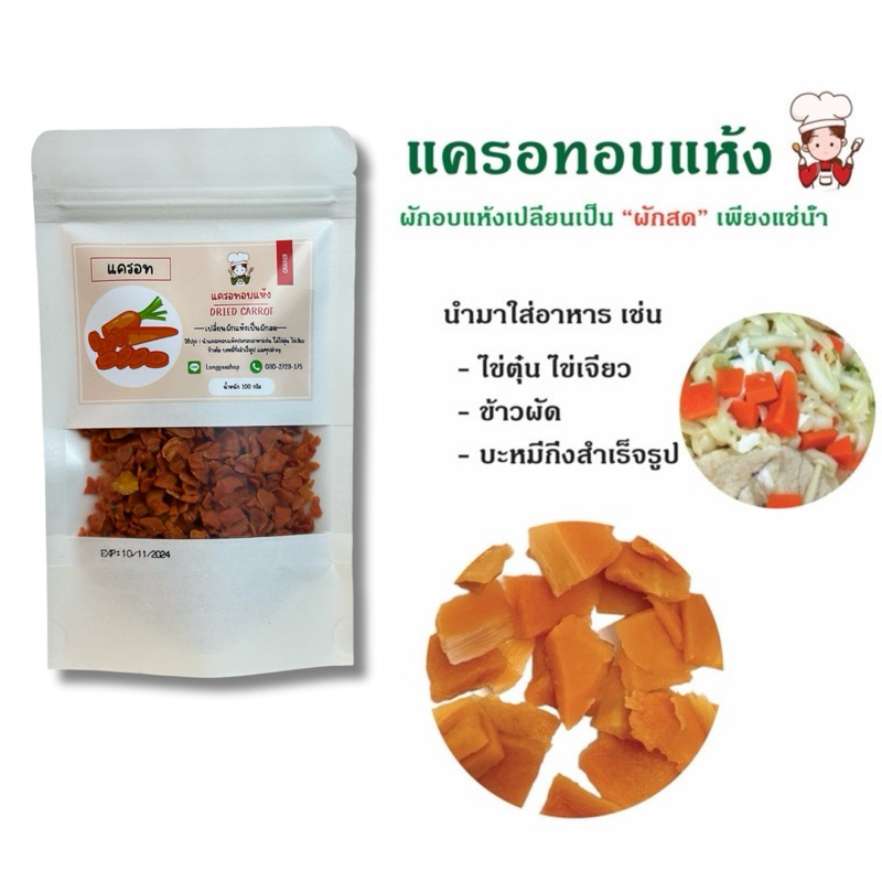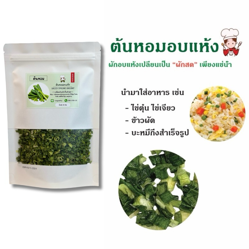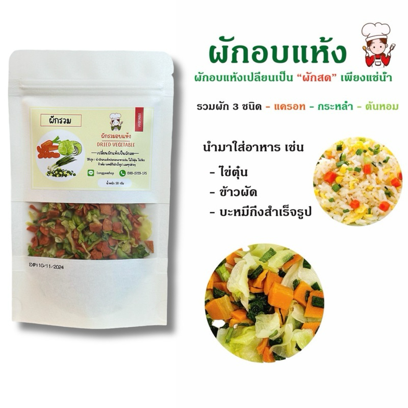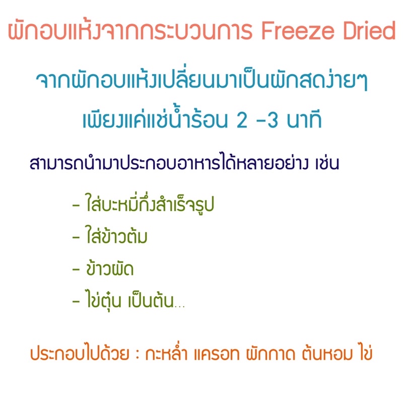 ผักอบแห้ง ขนาด 50,100 และ 250 กรัม ประกอบอาหารเช่น บะหมี่กึ่งสำเร็จรูป ข้าวต้ม ข้าวผัด ไข่ตุ๋น