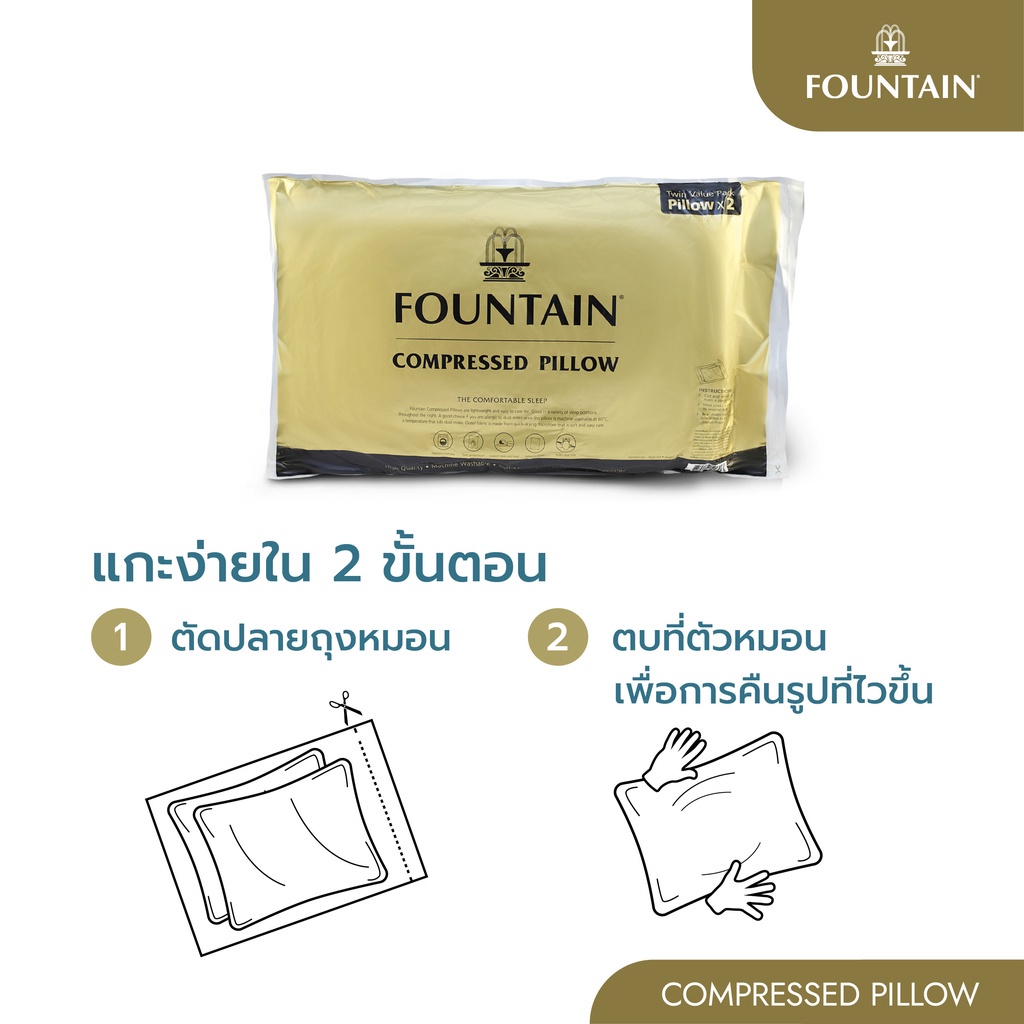 Fountain หมอนหนุนสุญญากาศ 2 ใบ Compressed Pillow หมอนหนุนฟาวน์เทน ซัพพอร์ตศีรษะและลำคอ คืนตัวเร็ว นุ่มกำลังดี