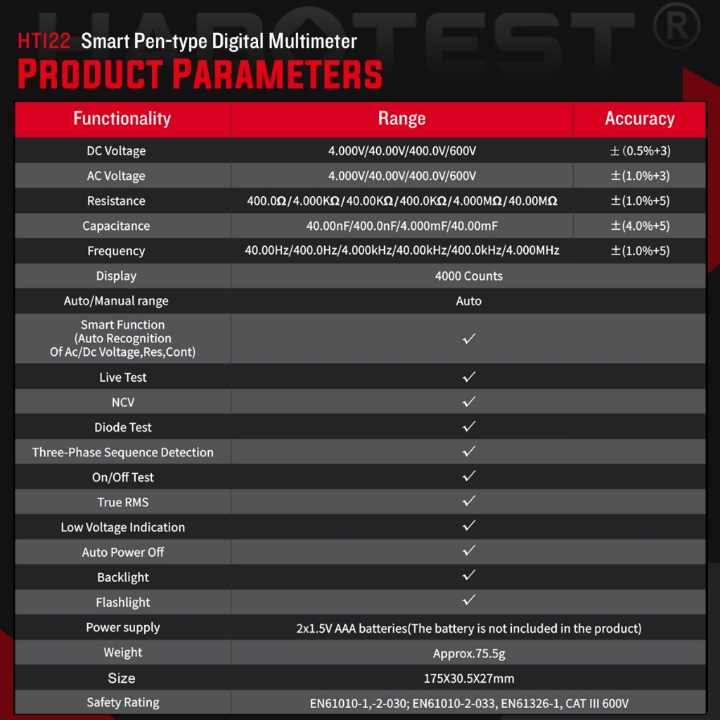 HABOTEST HT122 ปากกา อัจฉริยะ มัลติมิเตอร์ 600V AC/DC มัลติมิเตอร์ดิจิตอล 4000 การนับ มัลติมิเตอร์ NCV AC / DC ตรวจจับลําดับเฟสอัตโนมัติ