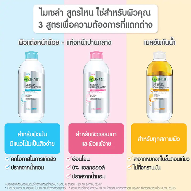 GARNIER การ์นิเย่ ผลิตภัณฑ์ทำความสะอาดผิวหน้า ไมเซล่า คลีนซิ่งวอเตอร์ ขนาด 125/400 มล.
