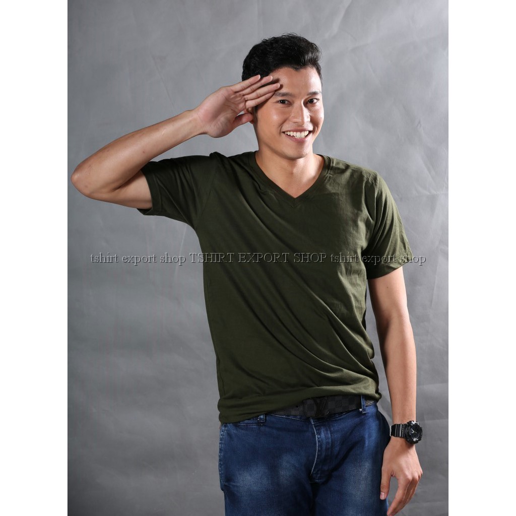 เสื้อยืด แฟชั่น ผู้ชาย ทรงตรง T-Shirt Cotton 100% คอวี แขนสั้น สีเขียวขี้ม้า