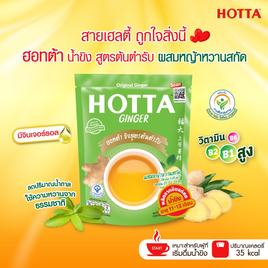 [ยกโหล] HOTTA น้ำขิงฮอทต้า เครื่องดื่มขิงผงสำเร็จรูป ขิงต้นตำรับ ผสมหญ้าหวานสกัด ขนาด 14 ซอง (12 ถุง)