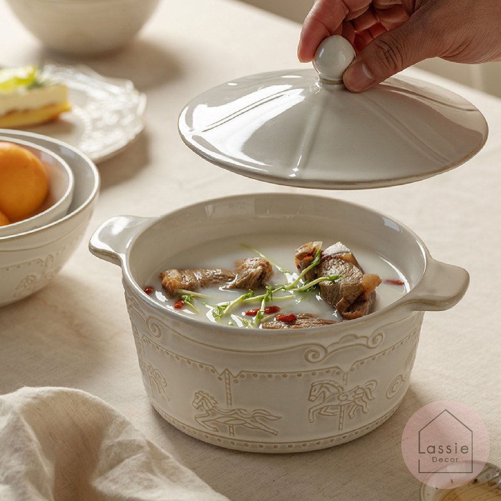 🎠เซตจานชามม้าหมุน จานเซรามิกวินเทจ ลายปั๊มนูนม้าหมุน สำหรับงานจัดเลี้ยง ใช้เป็นของขวัญขึ้นบ้านใหม่ Lassie Decor🎠