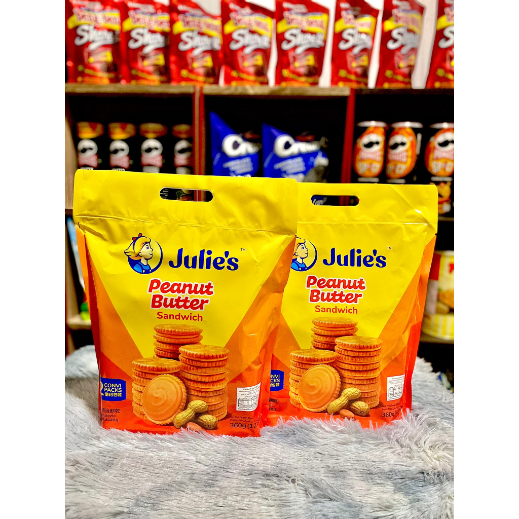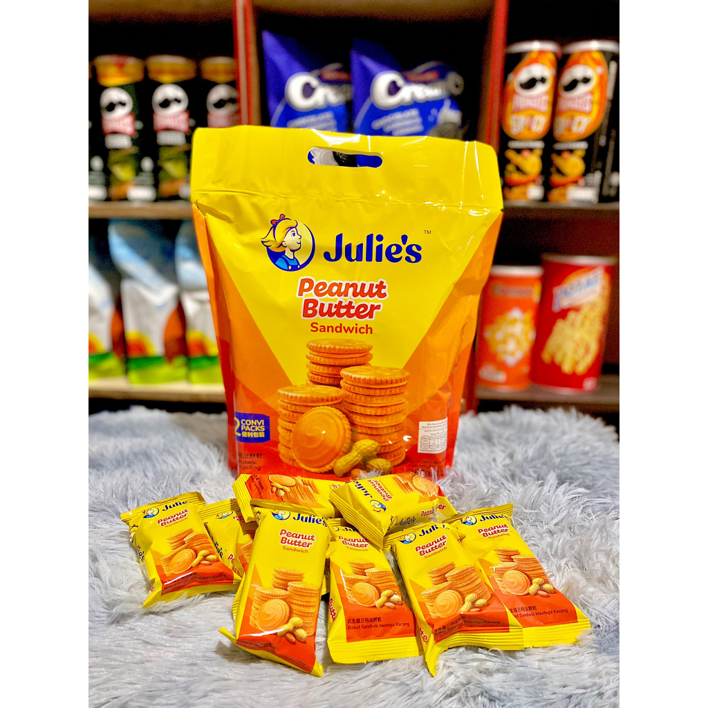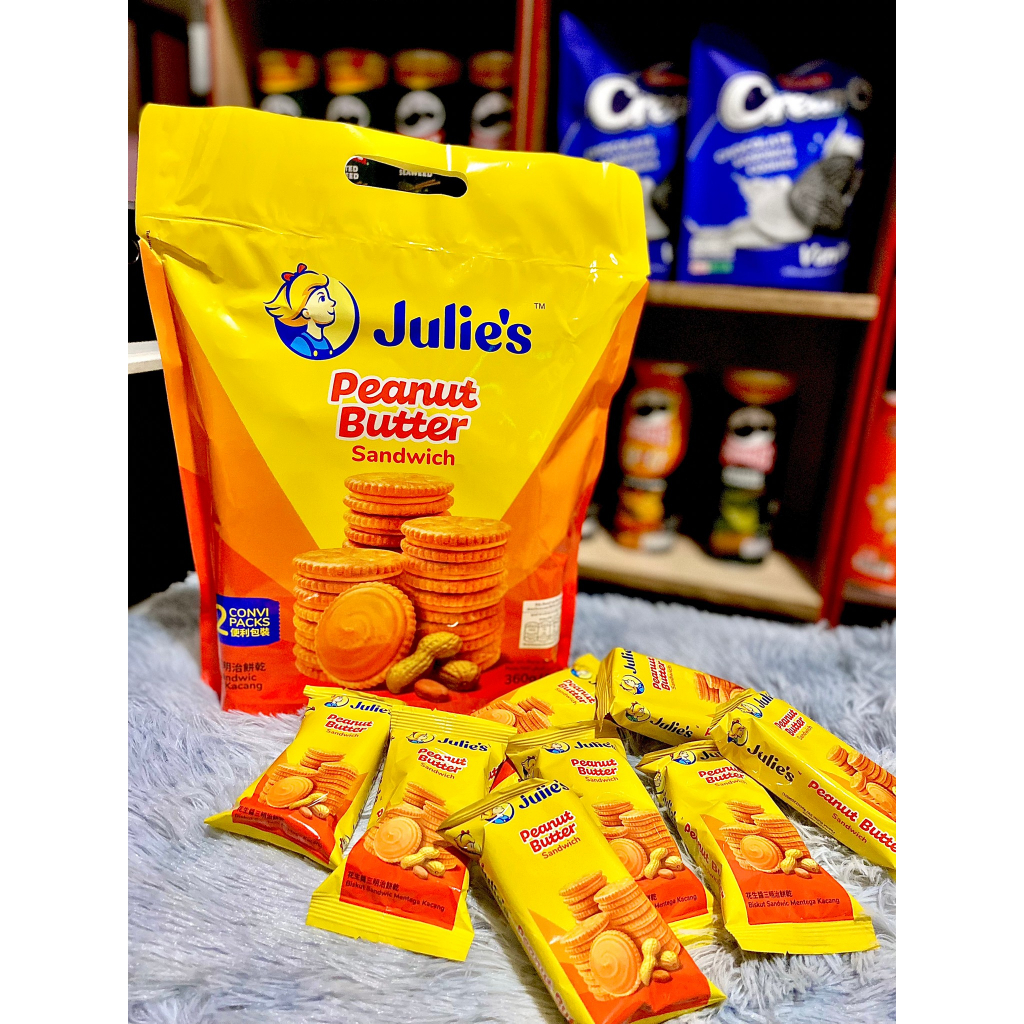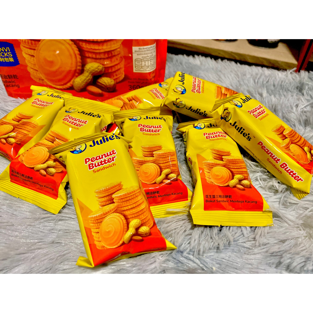 Julie จูลี่ แครกเกอร์จูลี่ บิสกิตเนยถั่ว ห่อใหญ่ ขนาด 360 กรัม มี 12 ซองแยก สอดไส้เนยถั่ว สินค้ามี อย. ไทย