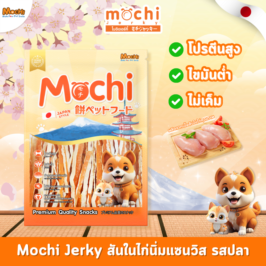 Mochi Jerky ขนมสุนัข สันในไก่นิ่มแซนวิชปลา ไม่เค็ม ไม่เติมเกลือ ขนาด 270 กรัม