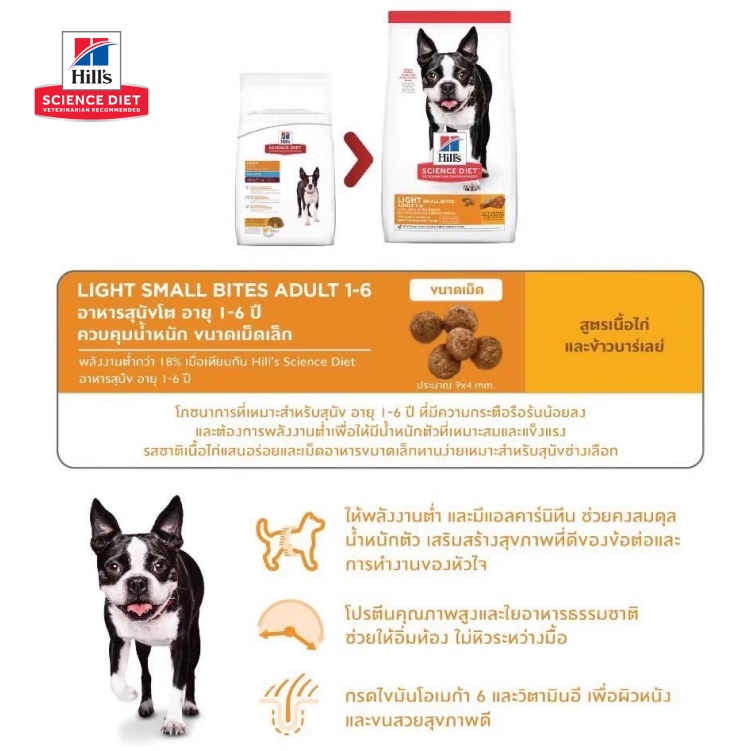Hill's ฮิลส์ อาหารสุนัข Science Diet Adult Light Small Bites สุนัขโต ทำหมัน ไขมันต่ำ คุมน้ำหนัก เม็ดเล็ก กระสอบ 12 kg