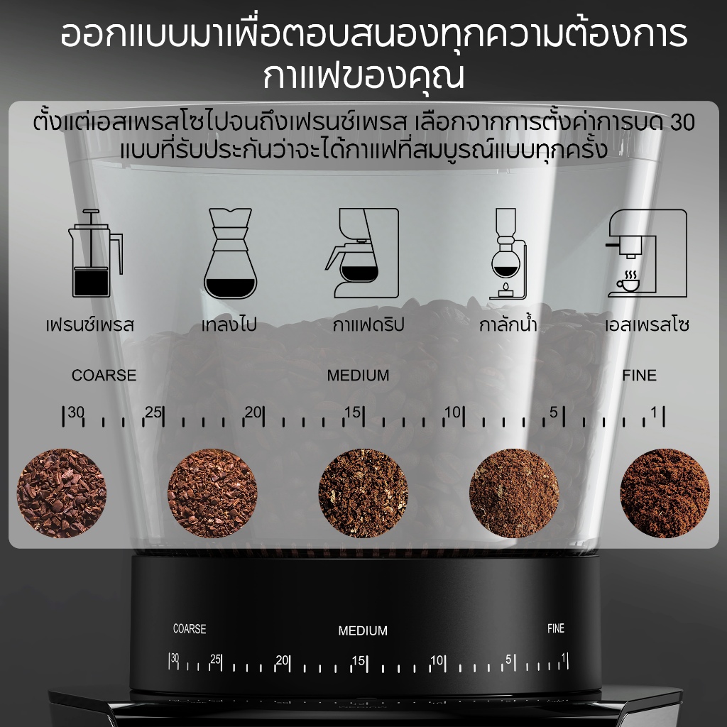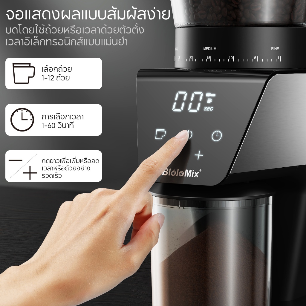 เครื่องบดเมล็ดกาแฟเสี้ยนไฟฟ้า Biolomix พร้อมการตั้งค่าที่แม่นยำ 30 แบบสำหรับวิธีเอสเปรสโซ ดริป เทริน และเฟรนช์เพรสโซ