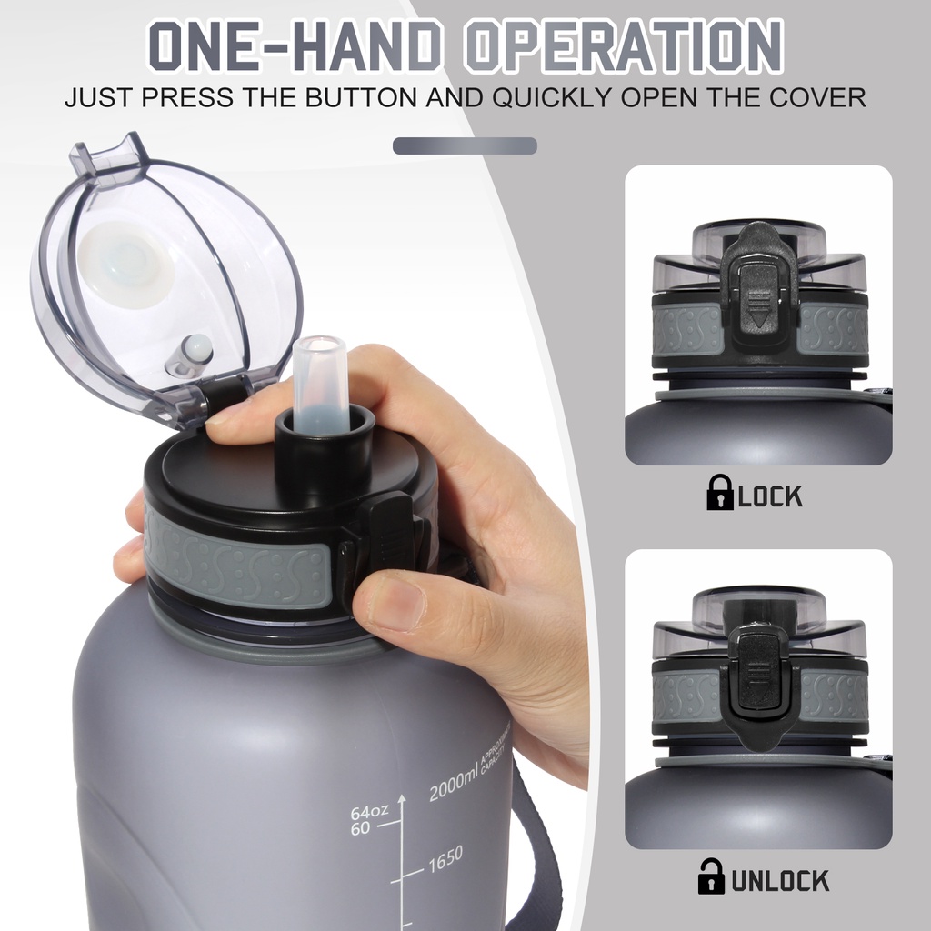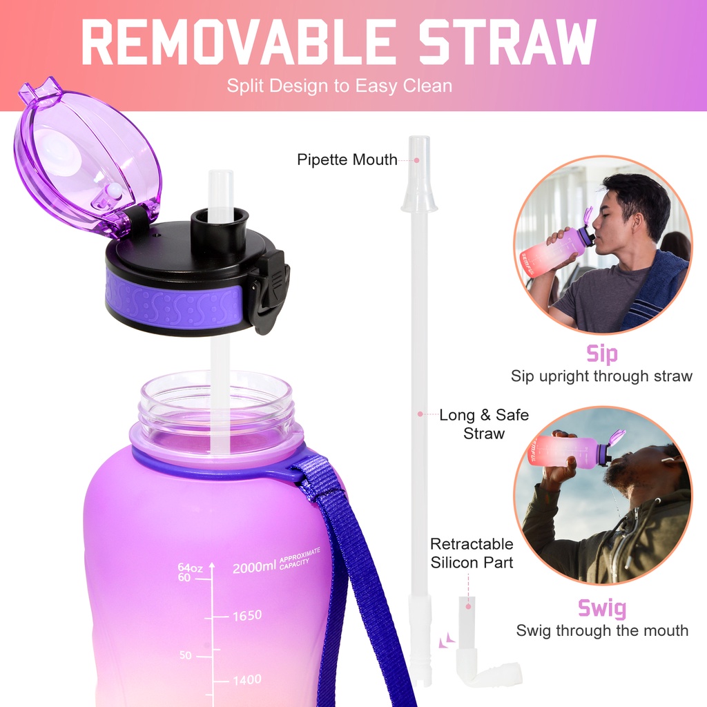 Gemful ขวดน้ําขนาดใหญ่ 2 ลิตร พร้อมฟาง ไม่รั่วซึม ปลอด BPA เหยือกดื่ม กันลื่น สําหรับฟิตเนส ยิม และกีฬากลางแจ้ง
