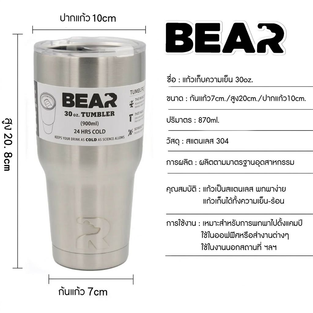 แก้วเก็บความเย็น20ชม.BEAR 30ออนซ์ สแตนเลส304 พร้อมฝากันน้ำหก ประกัน60วันไม่มีหยดน้ำเกาะ