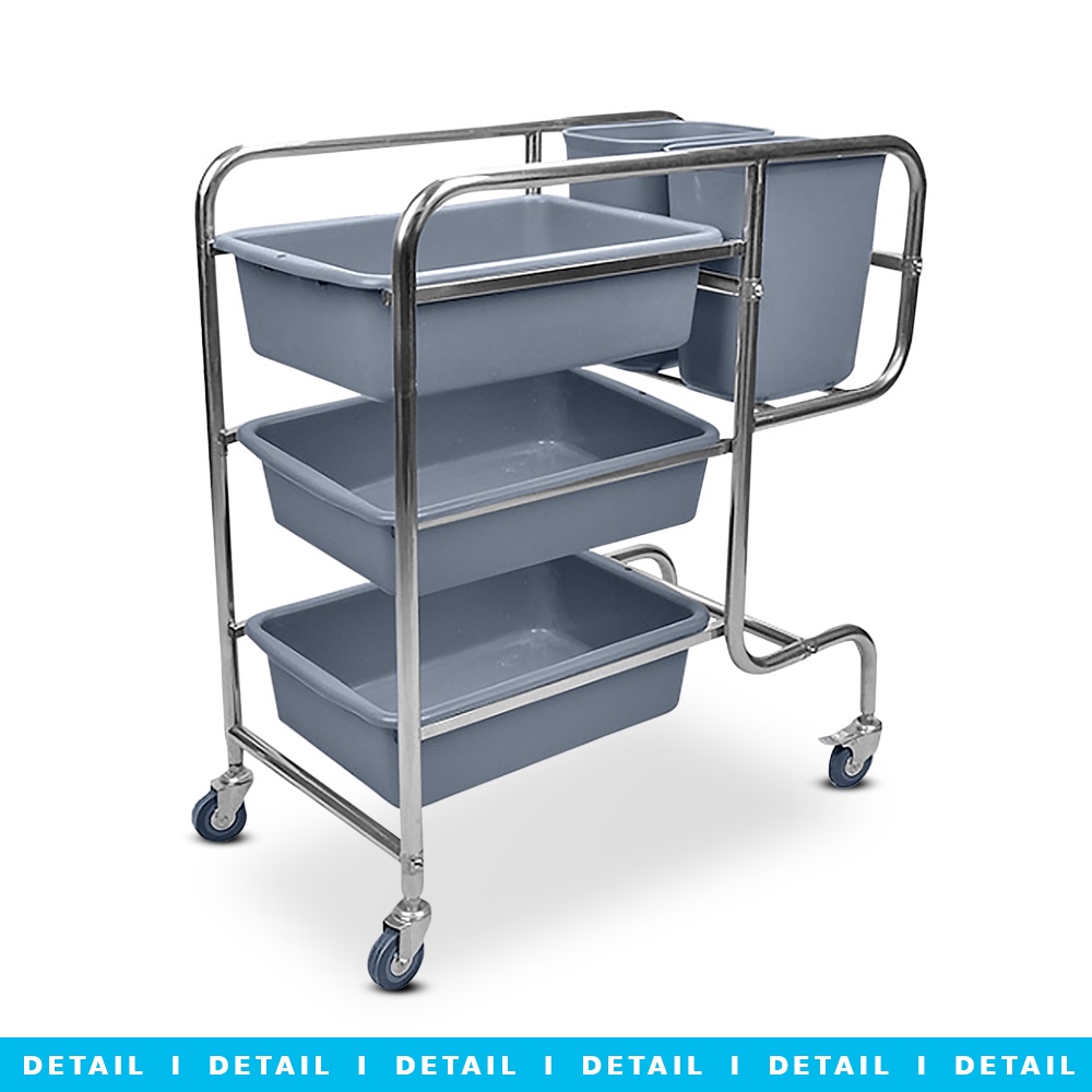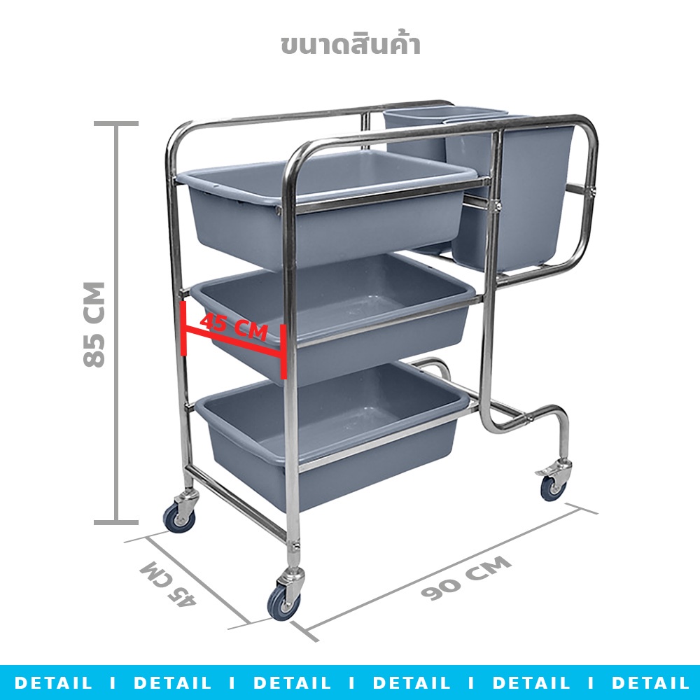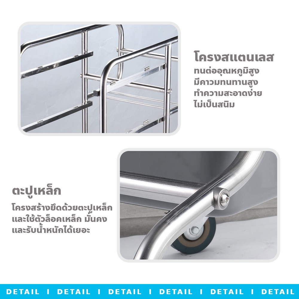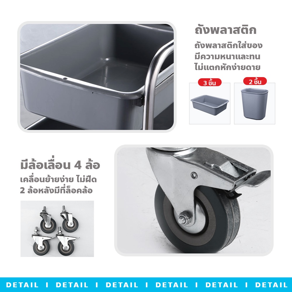 poodoo รถเข็นเก็บจาน พร้อมกระบะ 3 ใบและถังขยะ 2 ใบ รถเข็นอเนกประสงค์ สเตนเลส 3ชั้น