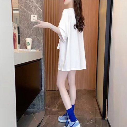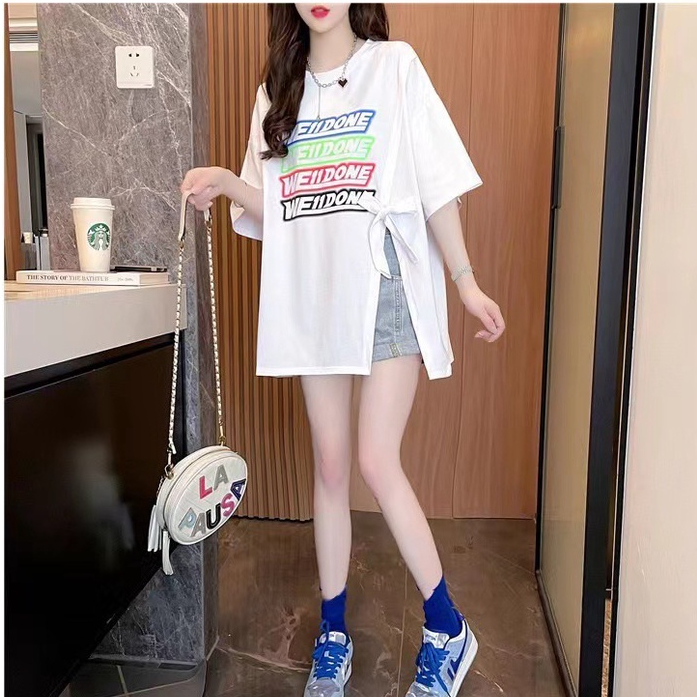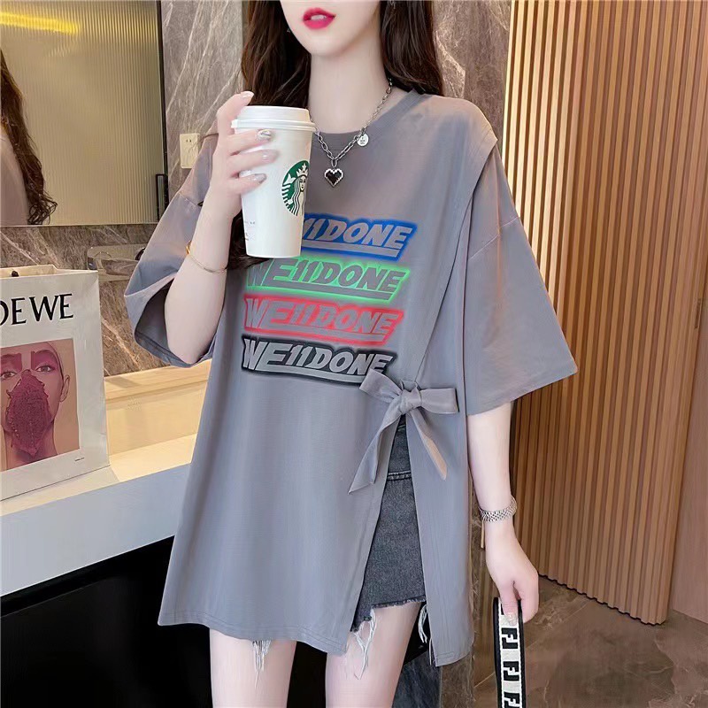 เสื้อแขนสั้น Oversize {อก 48 นิ้ว} คอกลม สกรีนลาย ผ่าข้างสููงผูกโบว์ ผ้าคอตตอล พร้อมส่ง A55