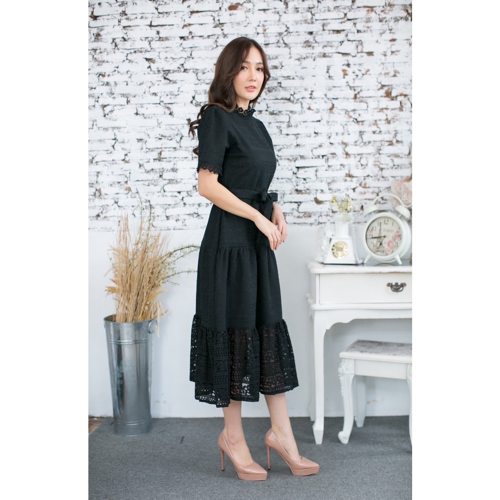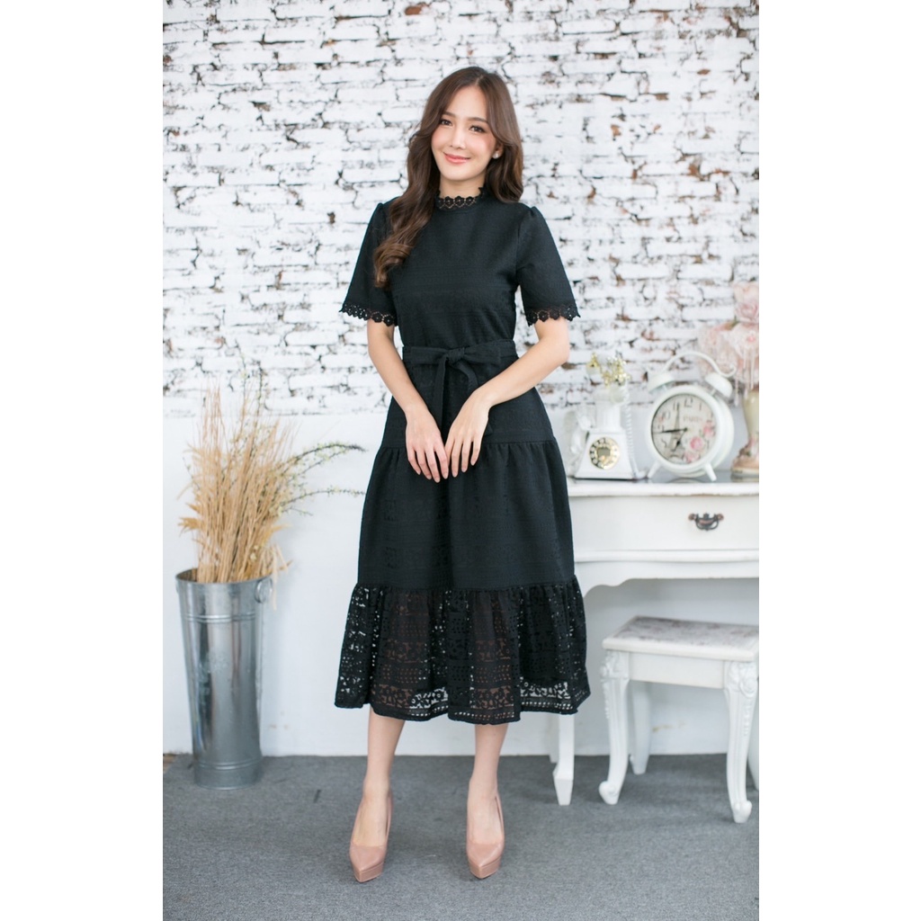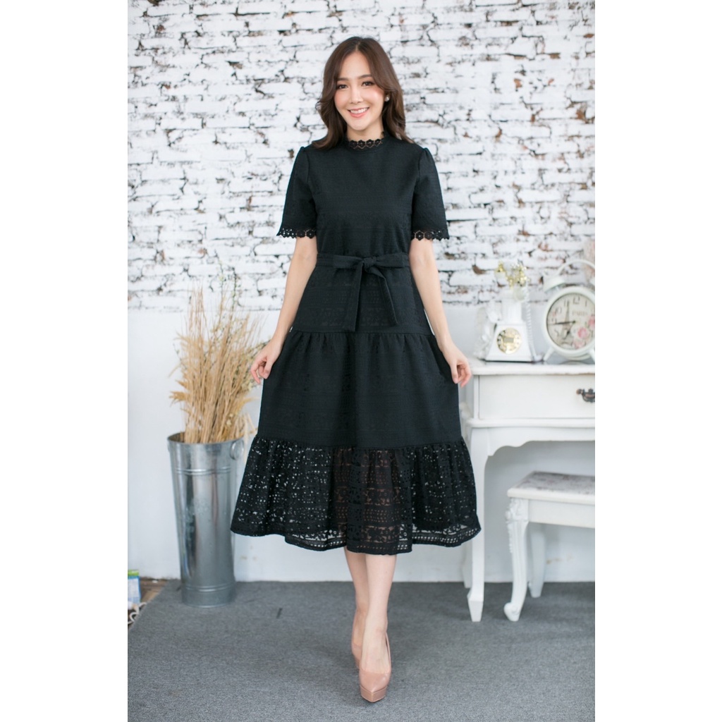พร้อมส่ง!!!! ชุดเดรส ผูกเอว แยกสาย ลูกไม้นิ่ม (สีดำ) Love Love เดรส ผ้าลูกไม้เข้ารูปสวยตัดต่อลูกไม้