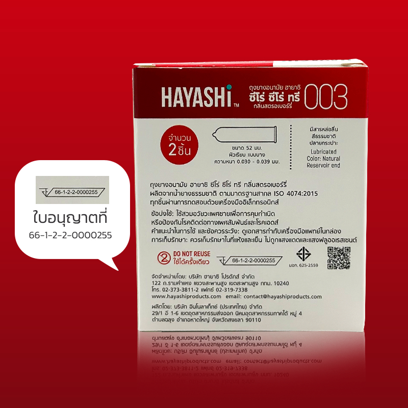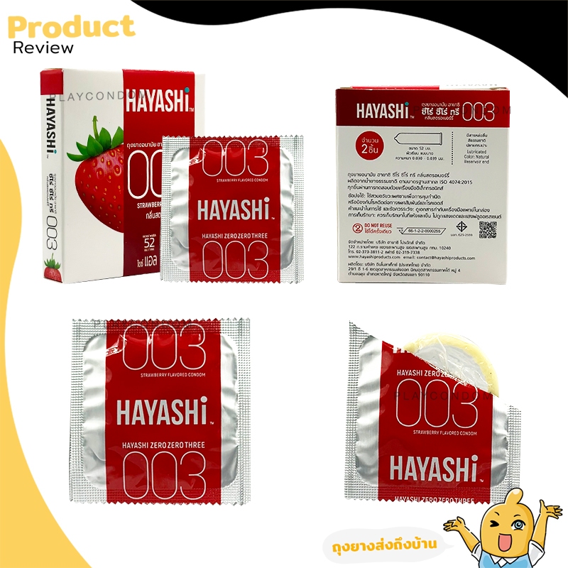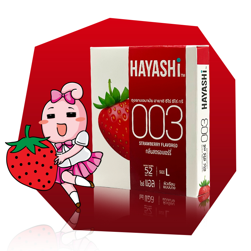 Hayashi 003 Strawberry Flavor ถุงยางอนามัย กลิ่นสตรอเบอร์รี่ บาง 0.03 มม. ขนาด 52 มม. บรรจุ 1 กล่อง (2 ชิ้น)