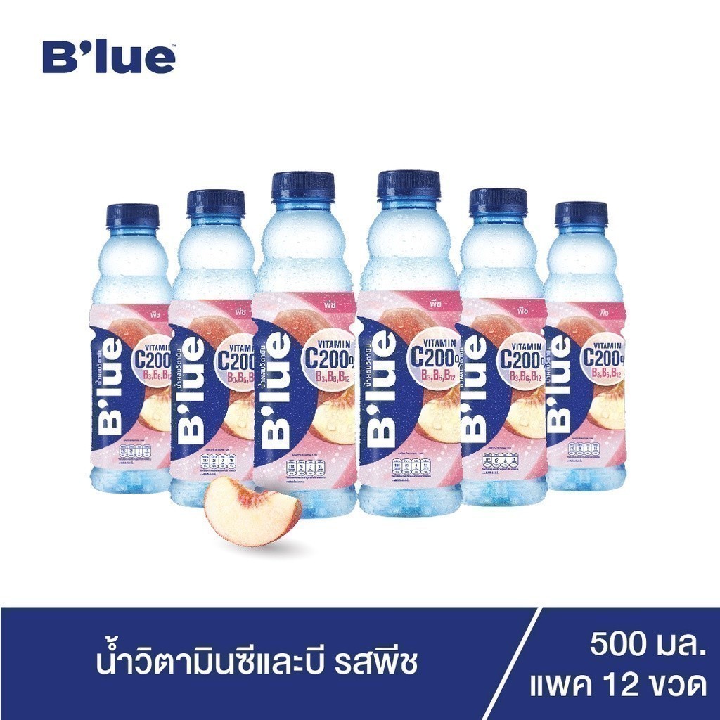 B'lue บลู น้ำผสมวิตามินซี 200% บี3 บี6 บี12 กลิ่นพีช (Vitamin Water - Peach) 500ml. จำนวน 12 ขวด