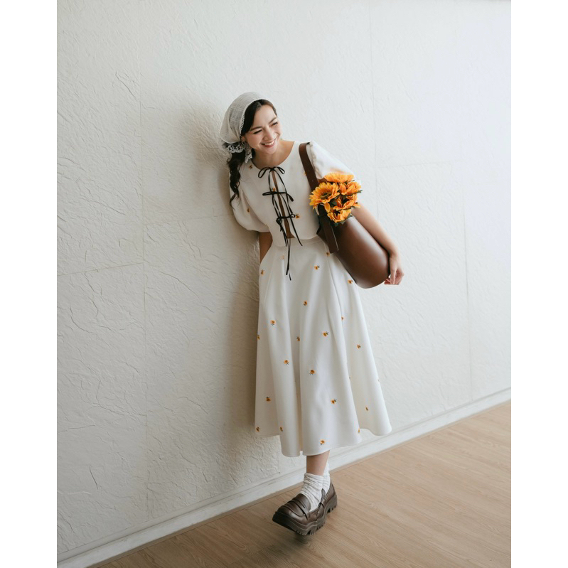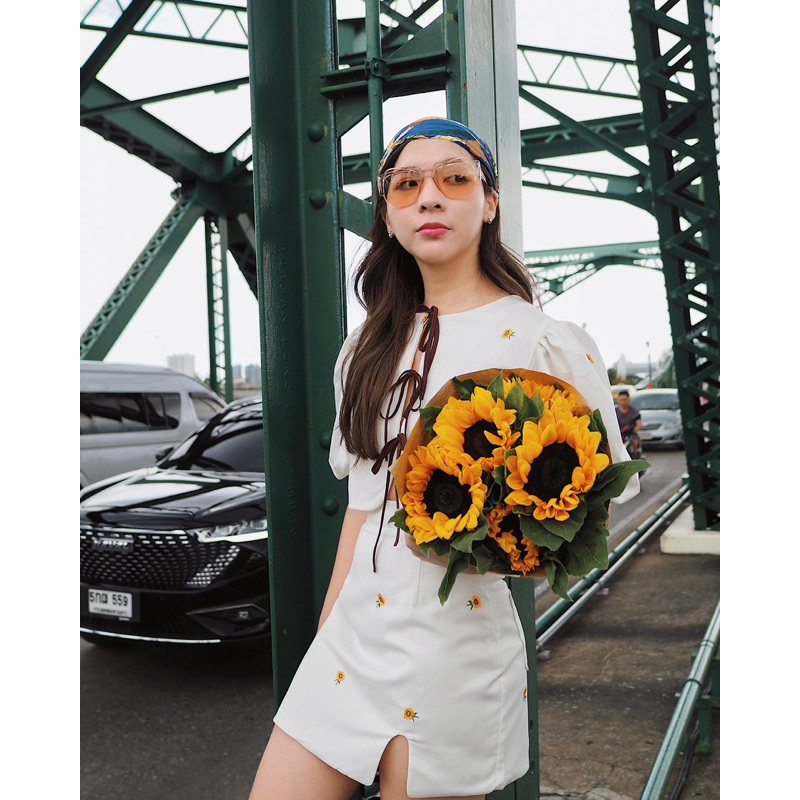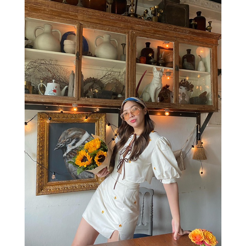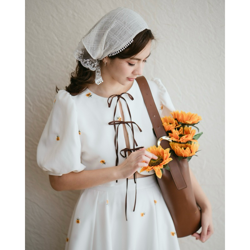 Joy mini Sunflower (เฉพาะเสื้อ) เสื้อครอปแขนพองแต่งโบว์ปักลายดอกทานตะวัน